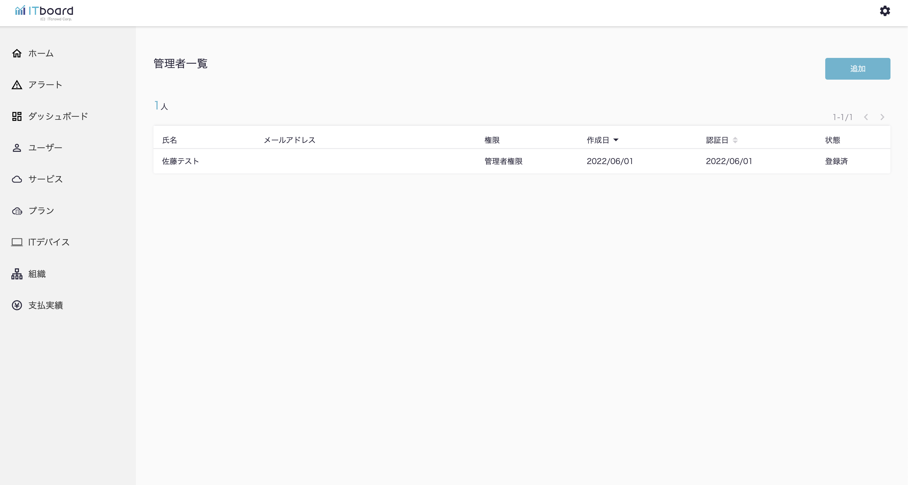 ITboardにログイン後、右上にある歯車マークから「管理者設定」押下し、管理者一覧画面に遷移します。