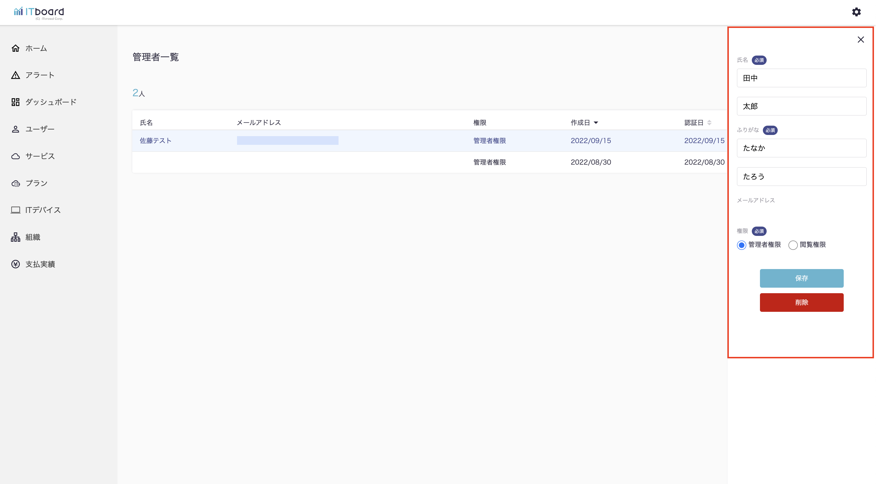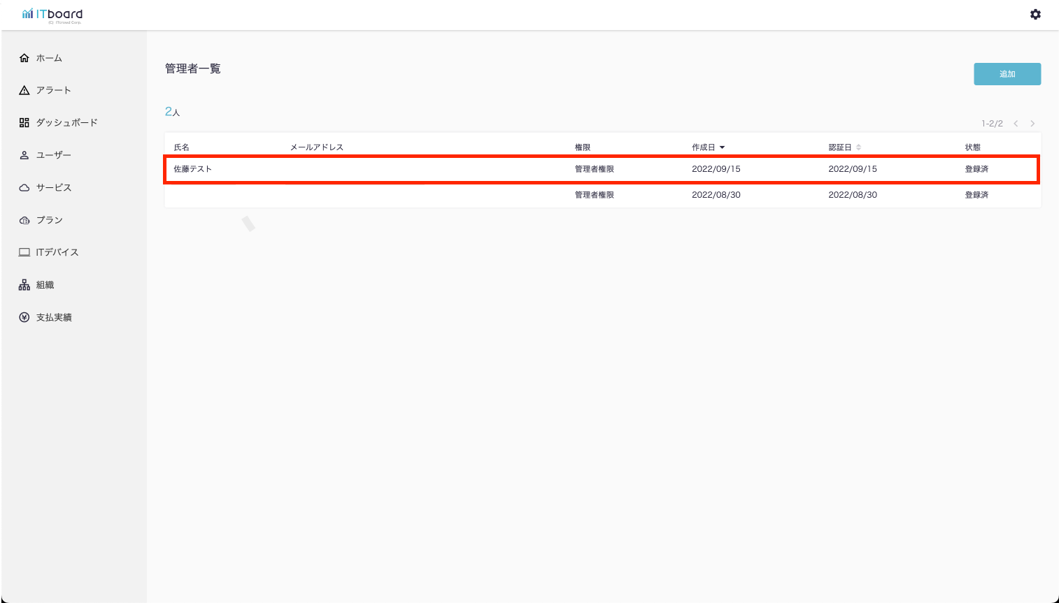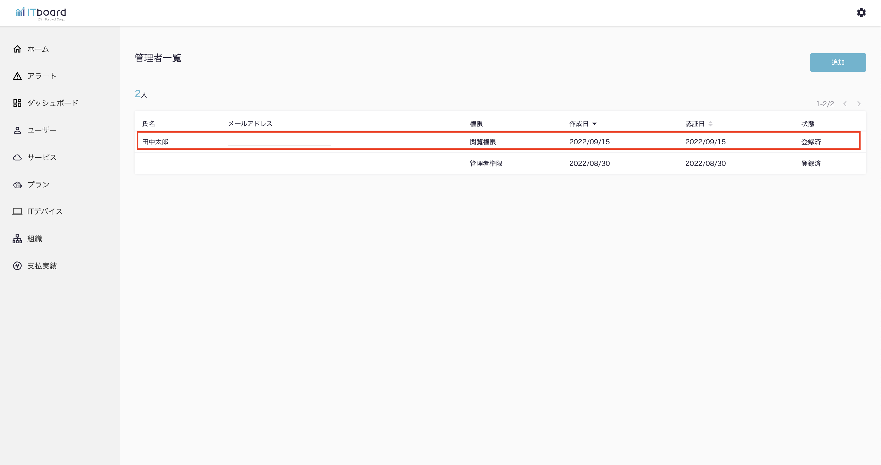 先ほど、編集した内容が対象の管理者に反映されていれば、管理者情報の変更は完了です。
