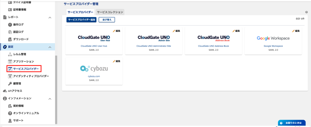 1.「設定/サービスプロバイダー」からサービスプロバイダー管理画面へ遷移する