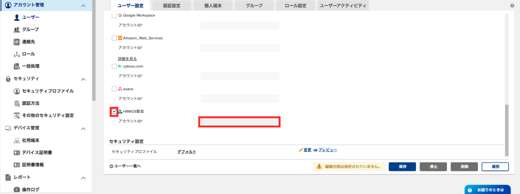 1.「アカウント管理/ユーザー」からサービスプロバイダーに紐付けたいユーザーのユーザー管理画面に遷移する