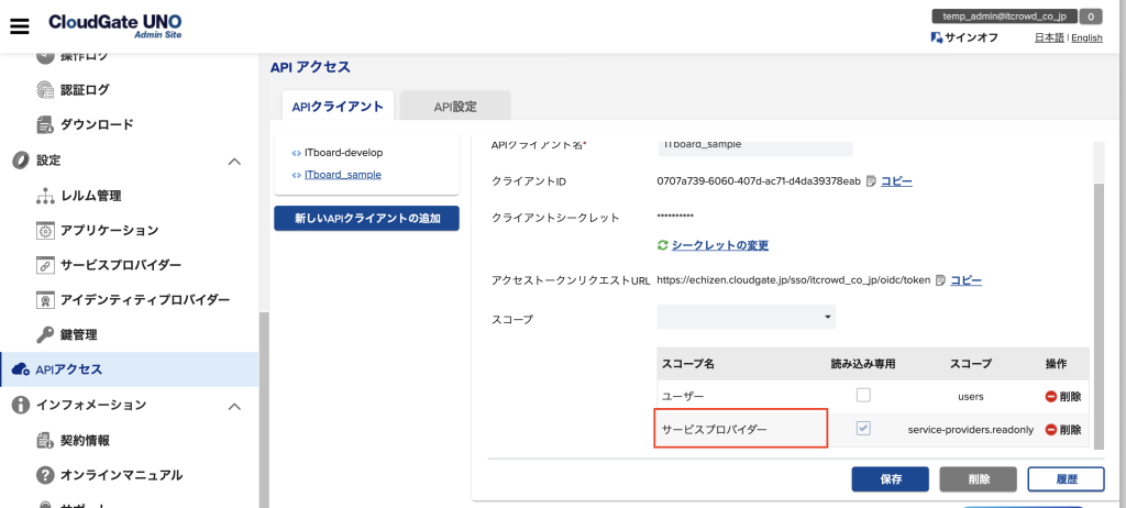 1.「APIアクセス」>「APIクライアント情報」>「スコープ」 にて「サービスプロバイダー」 を設定する必要がある。