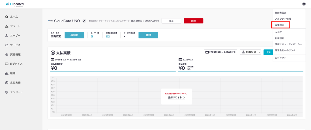 2.画面右上の歯車から「各種設定」をクリックする