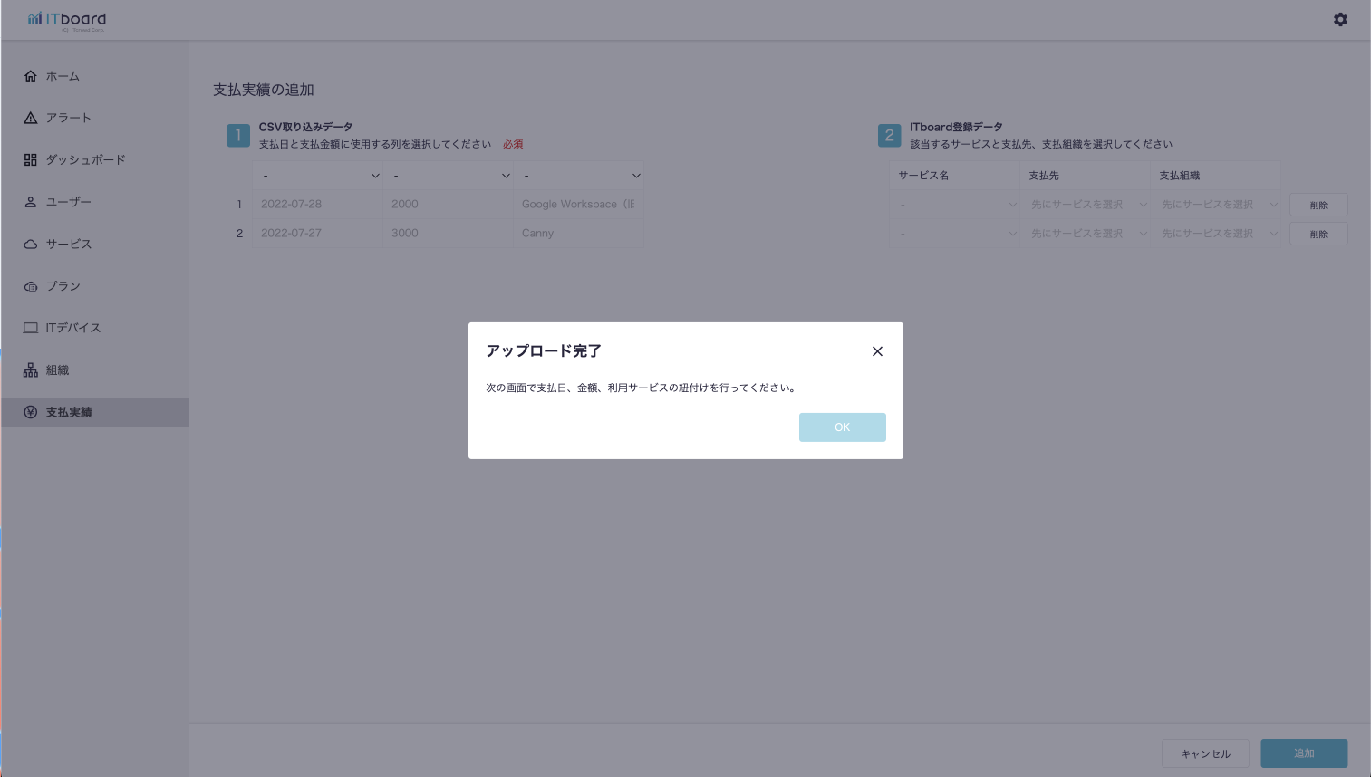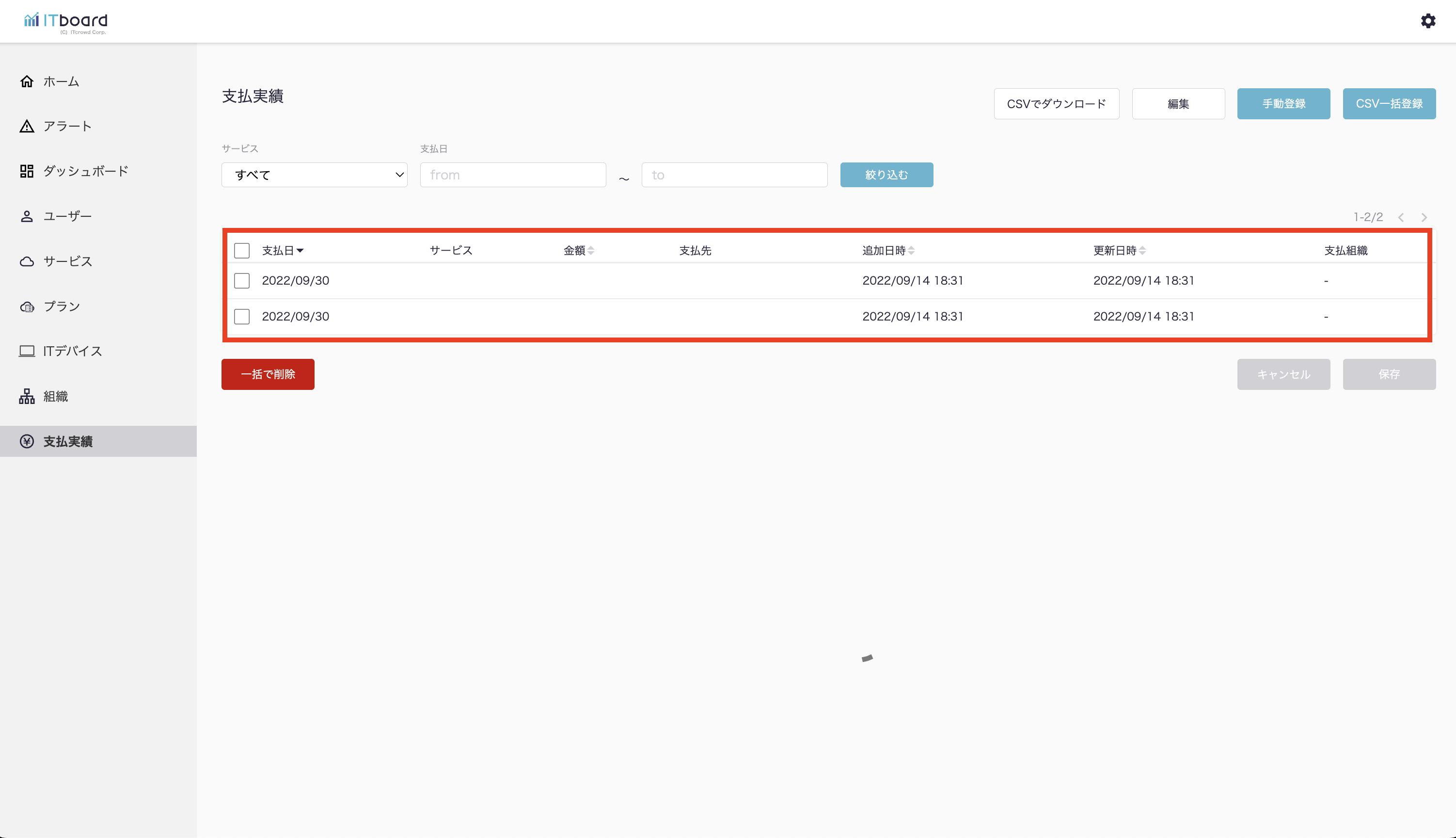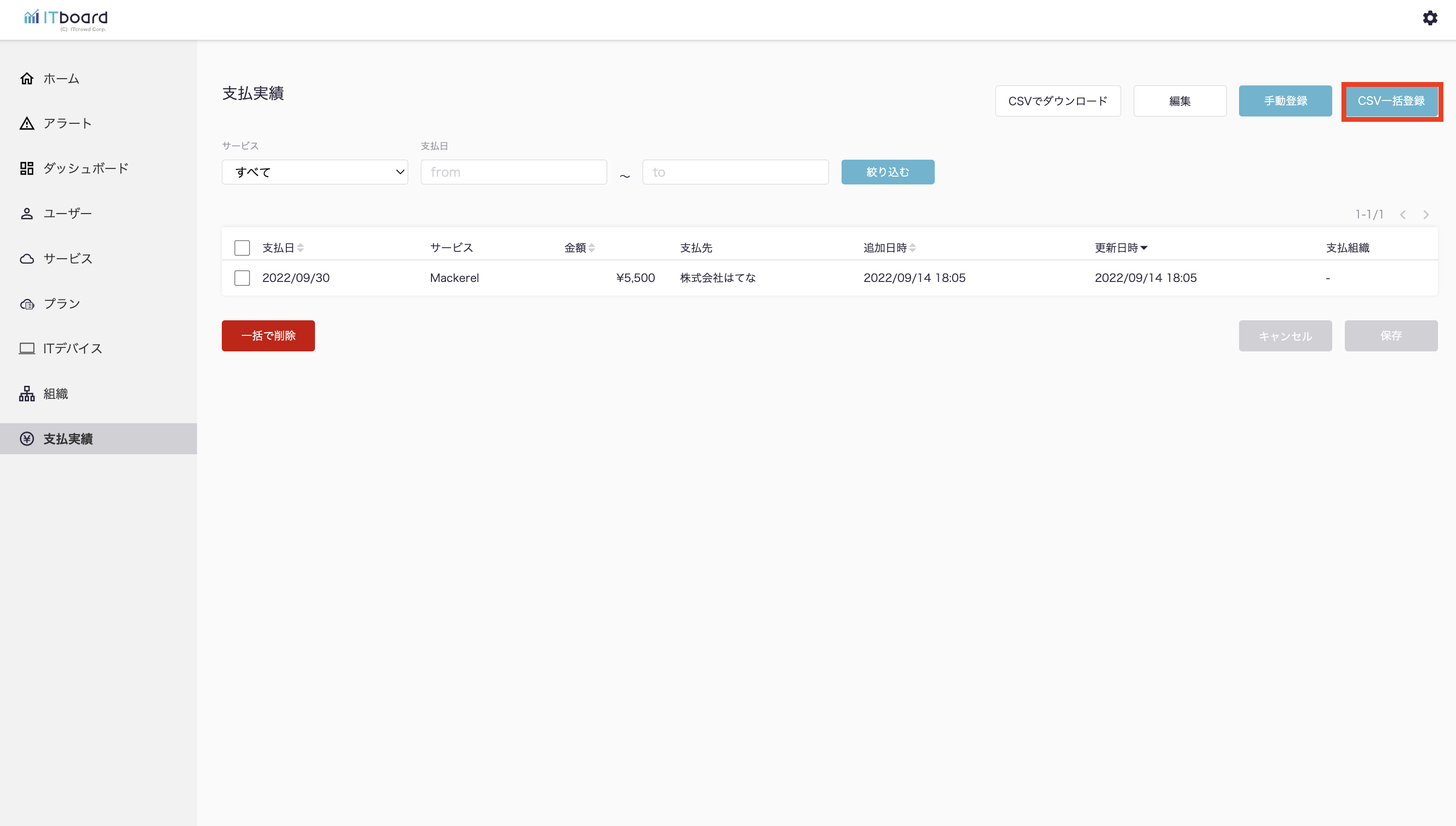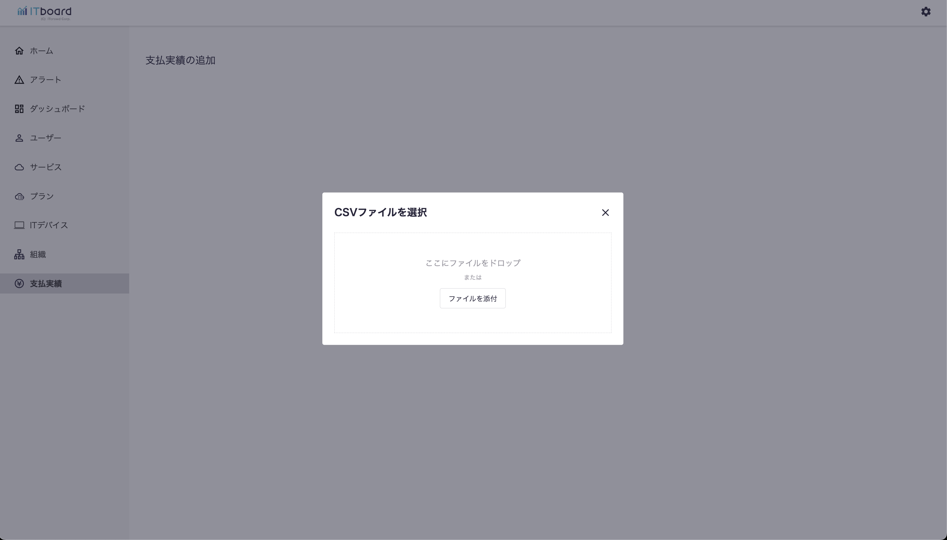 ITboardでは、各サービスの支払実績の登録をCSVファイルをアップロードして一括登録することが可能です。