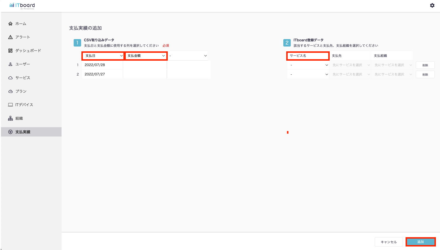 「支払日」「金額」「利用サービス」の紐付けを行い、「追加」ボタンを押下します。