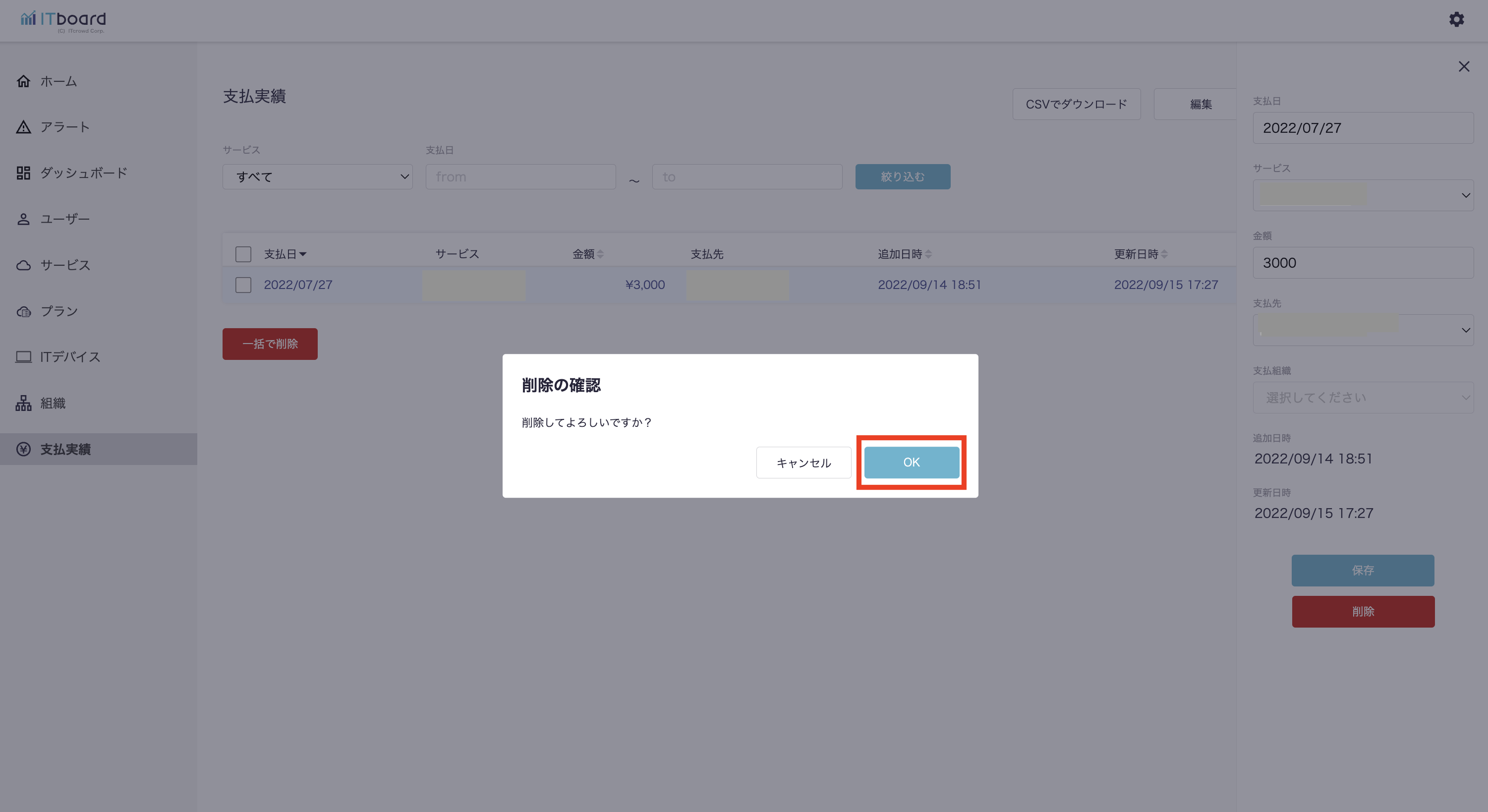 支払実績を選択すると、右ペインが表示され、「削除」ボタンを押下します。