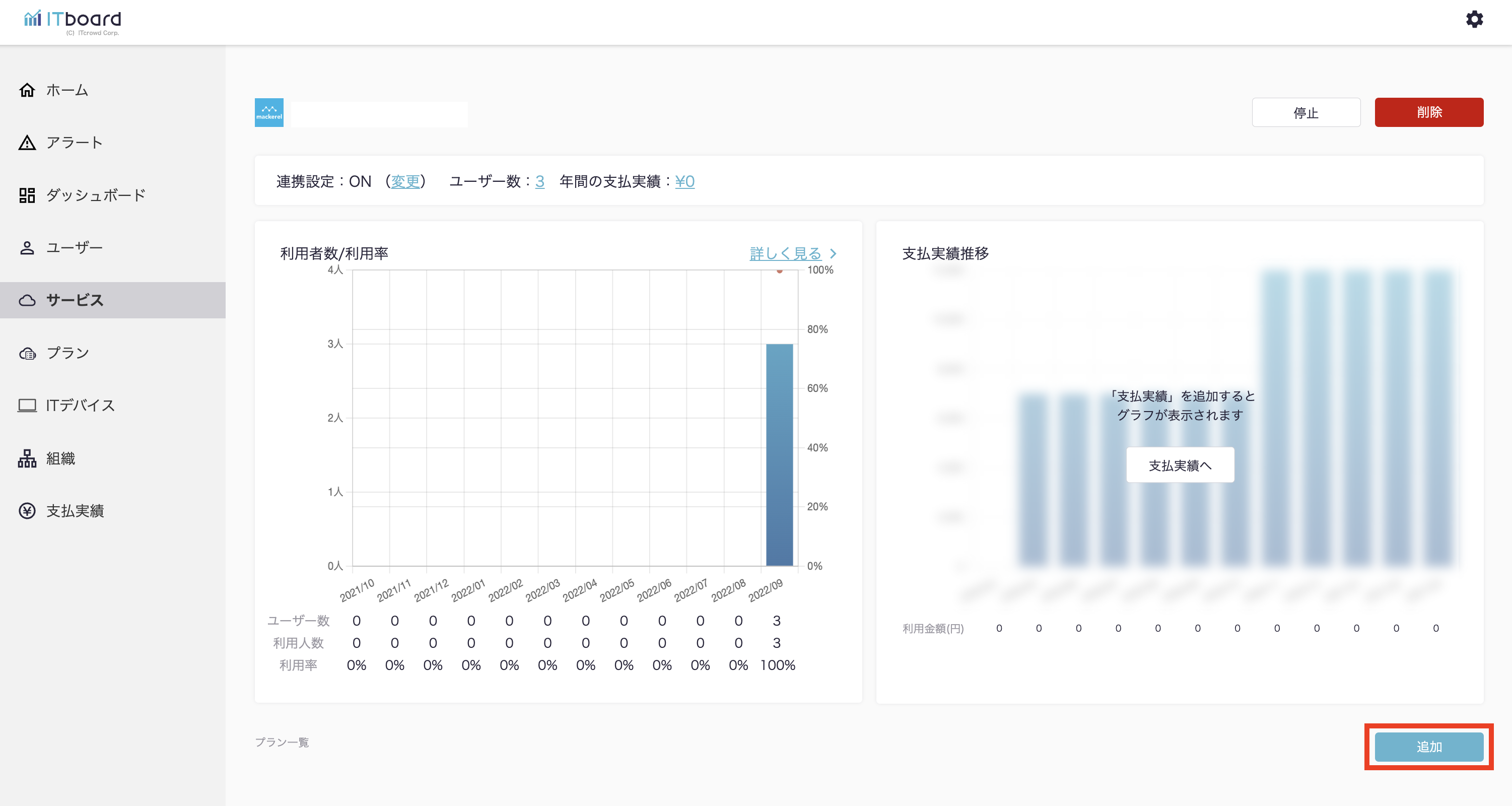 連携されたサービス画面から、プランの「追加」ボタンを押下します。