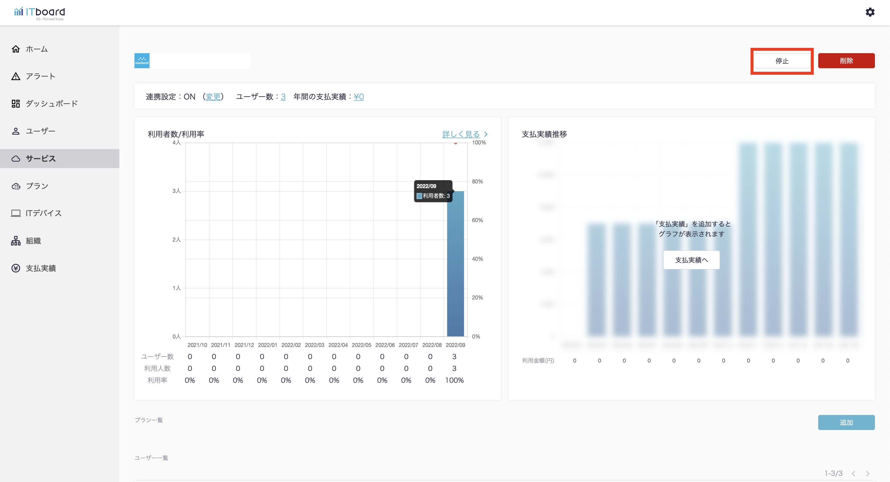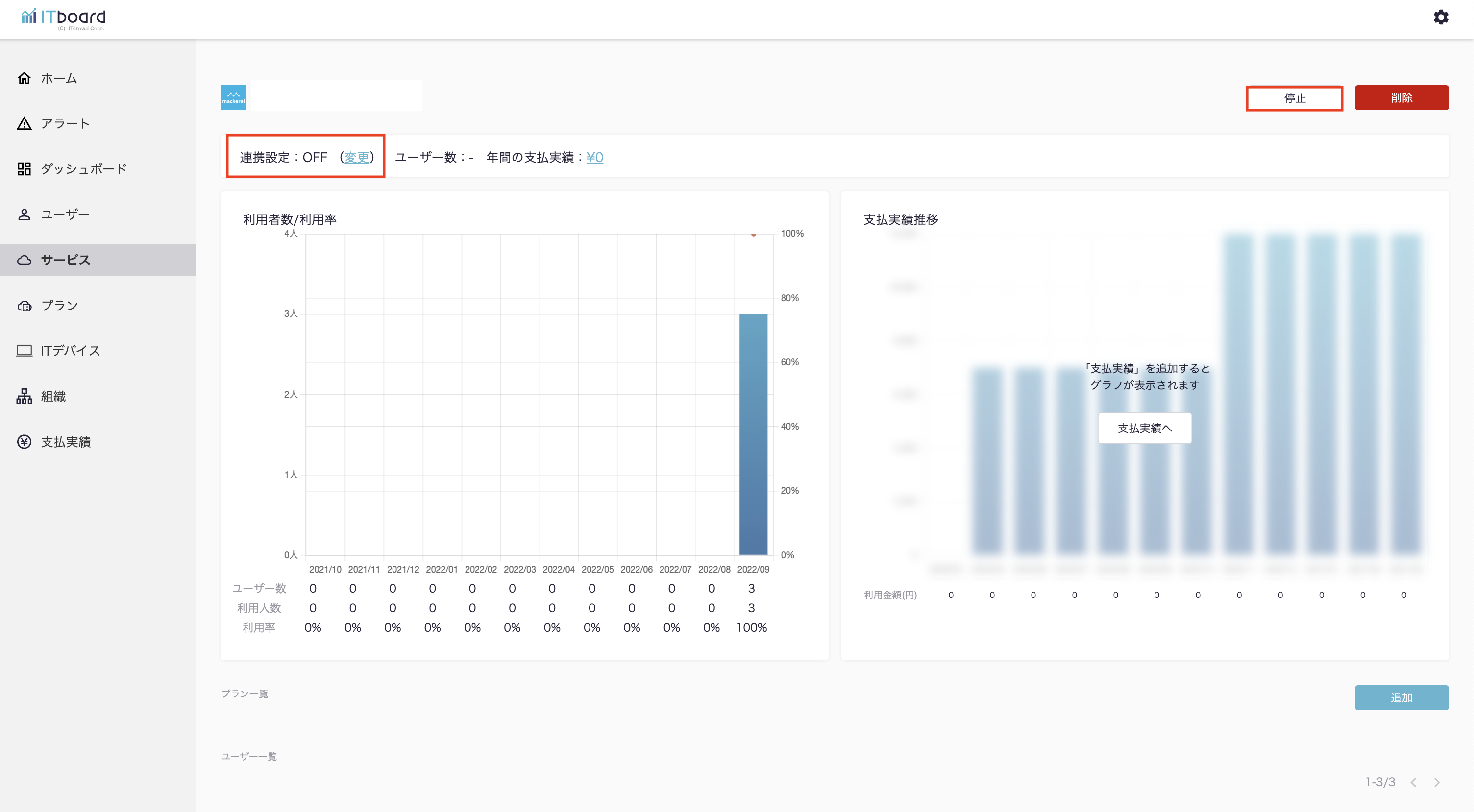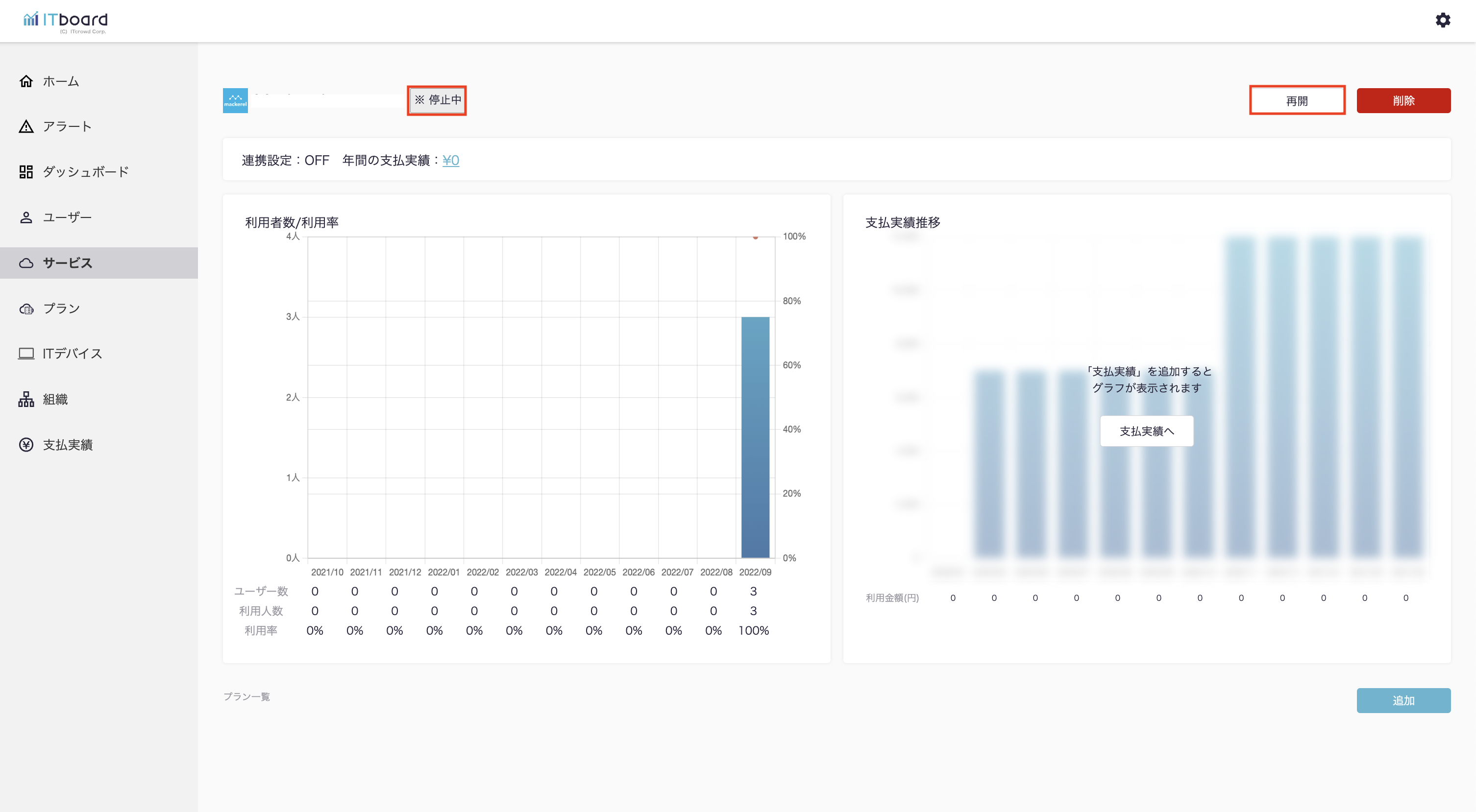 ITboardでは、追加したサービスを「停止」することができ、必要に応じて「再開」することも可能です。