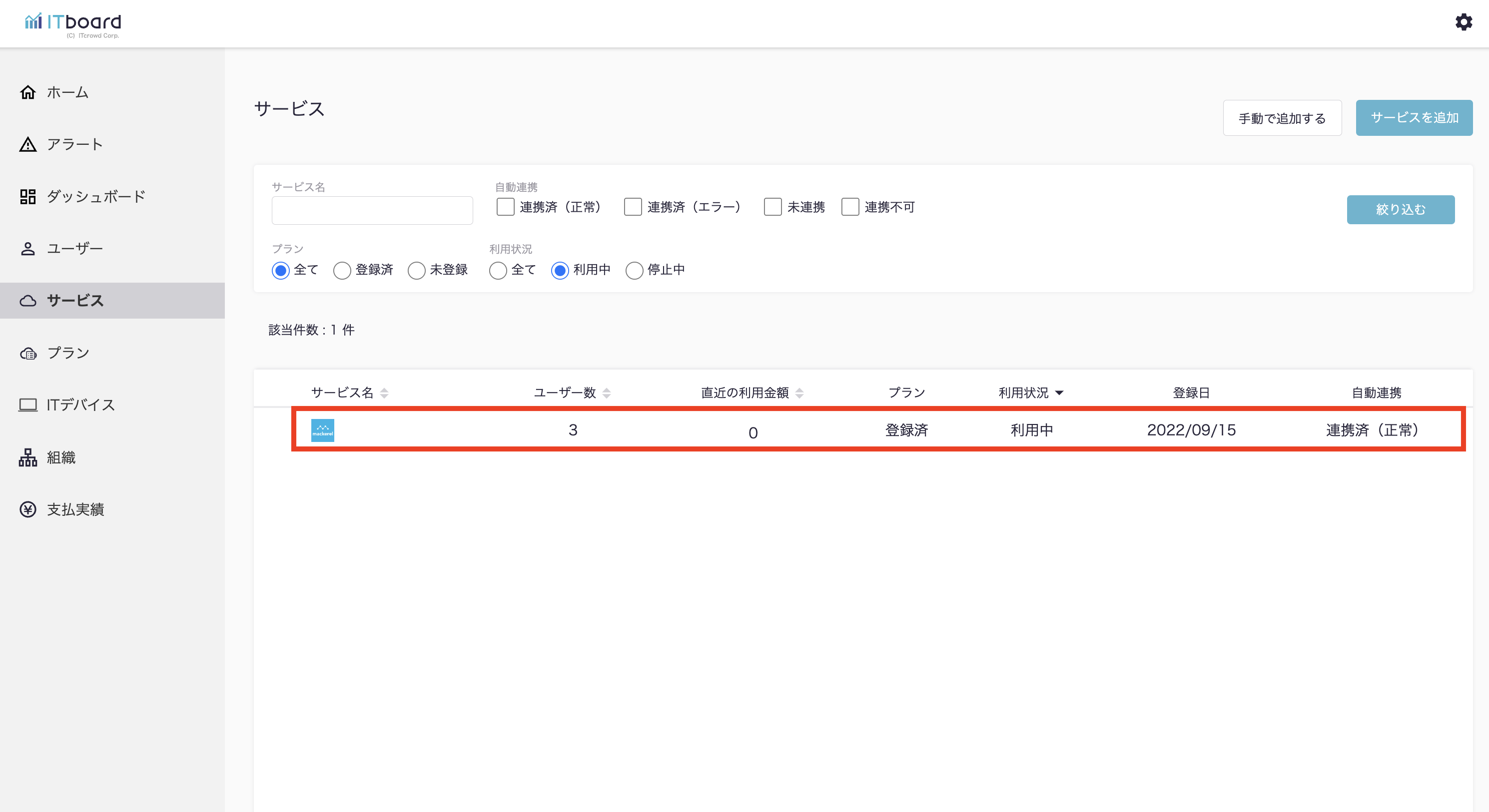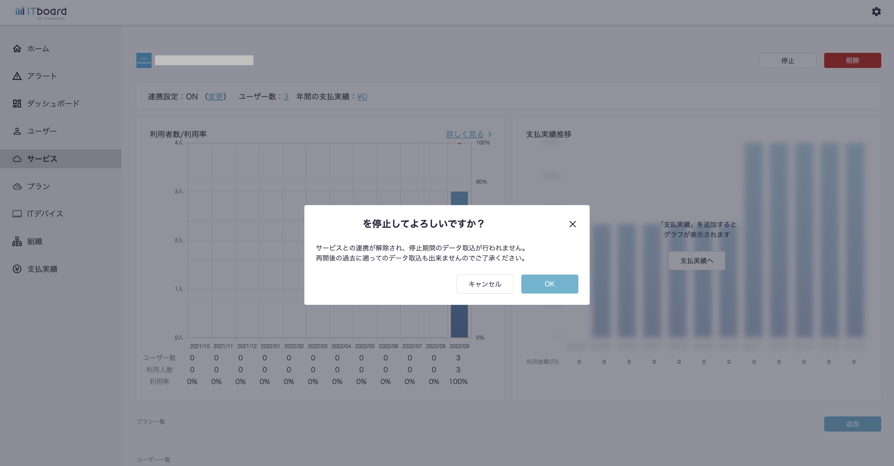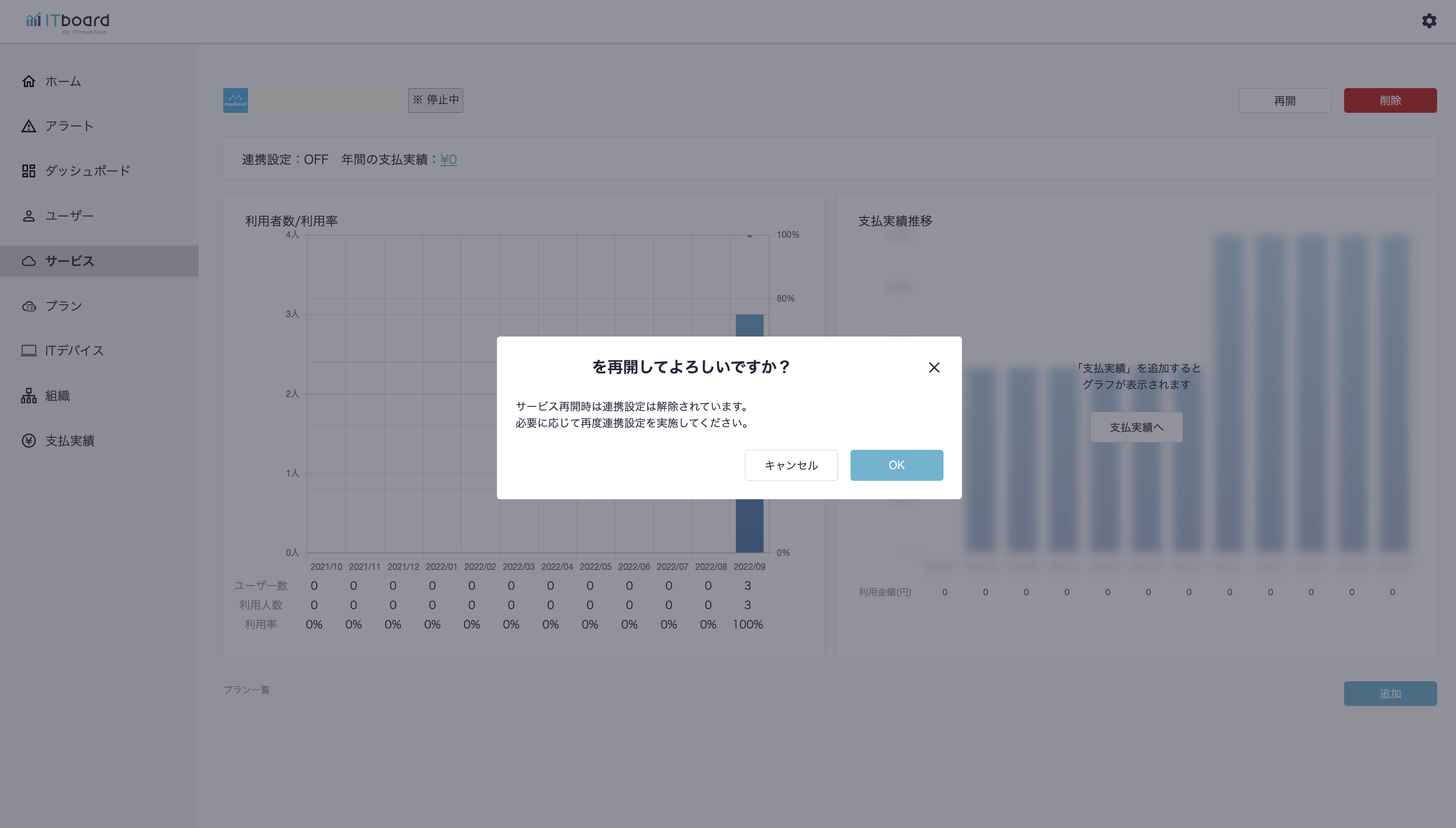 ITboardでは、追加したサービスを「停止」することができ、必要に応じて「再開」することも可能です。