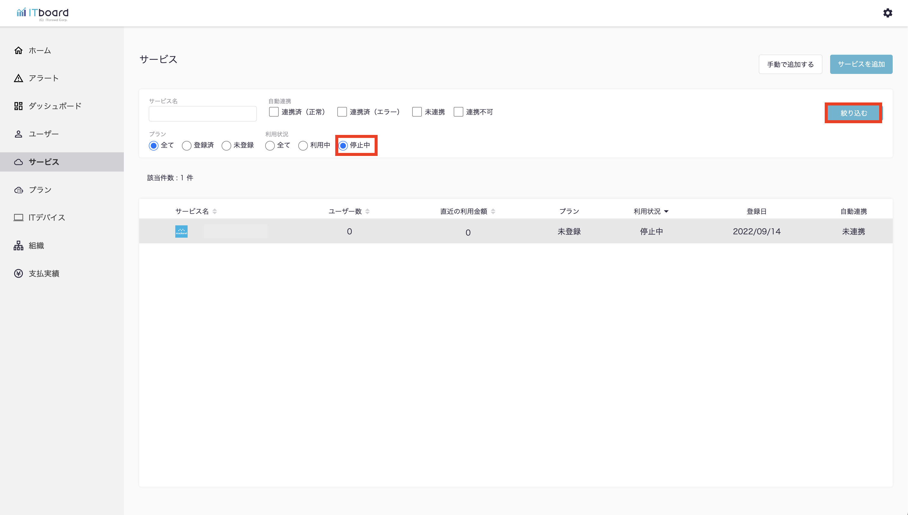 利用状況の「停止中」を選択し、「絞り込む」ボタンを押下し、停止中のサービスを表示します。