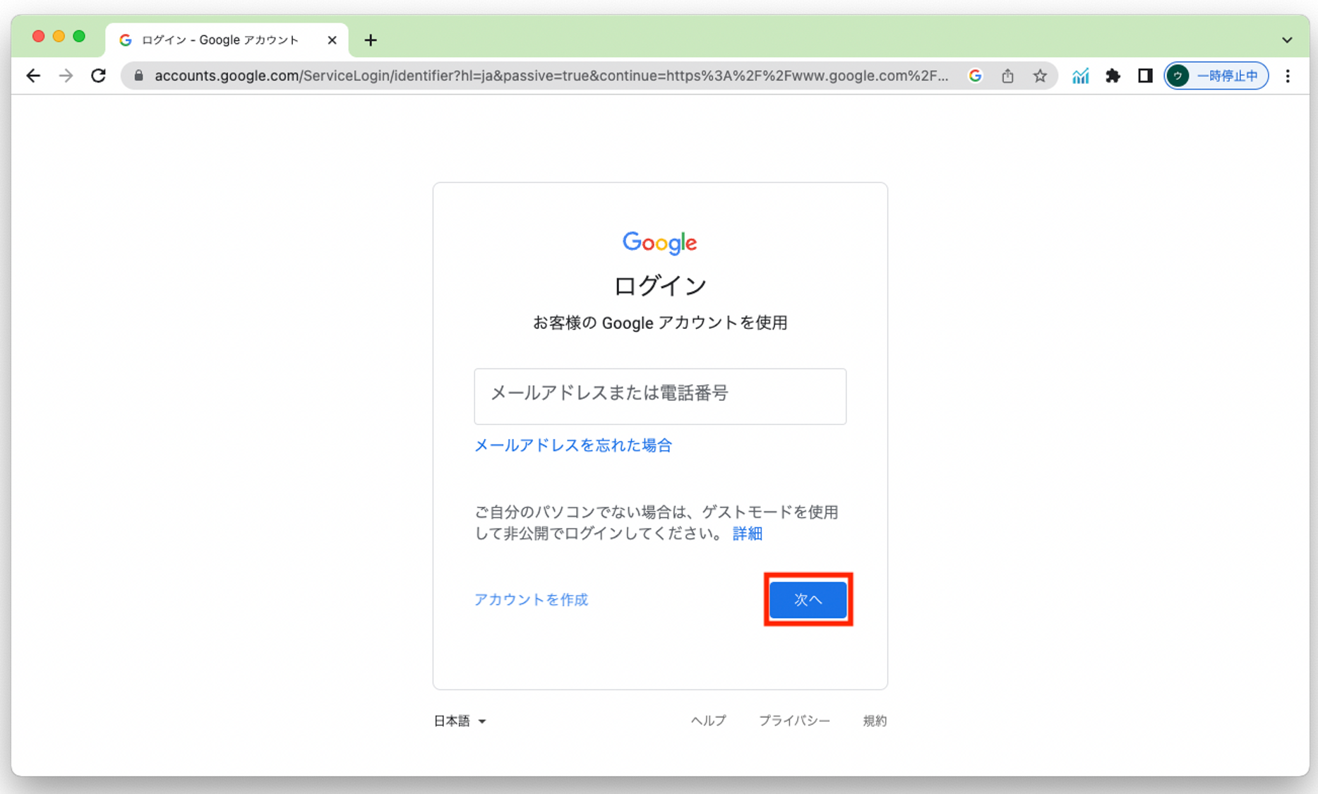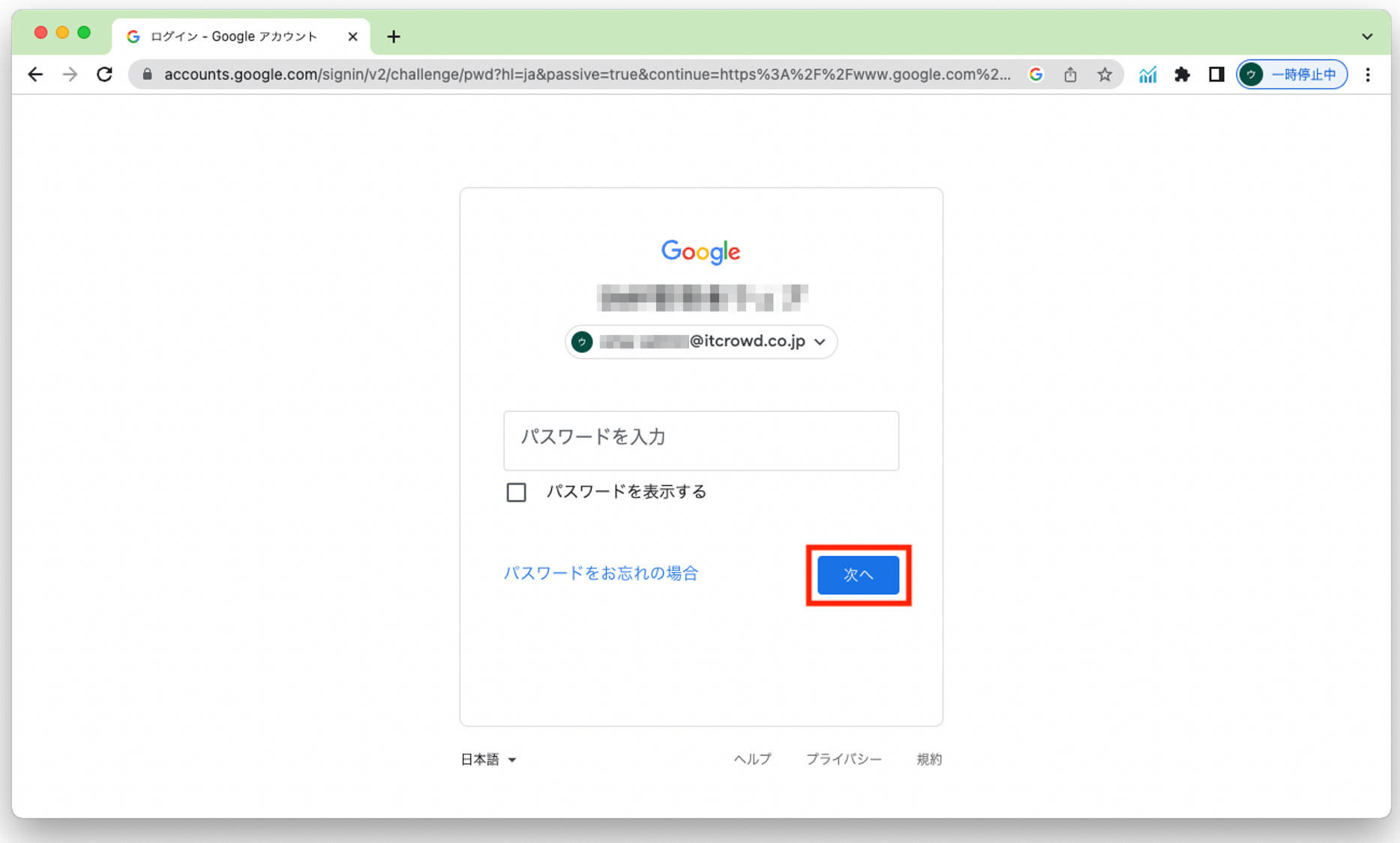 Google Workspace管理下のGoogleアカウントを入力して、[次へ]ボタンをクリックします。