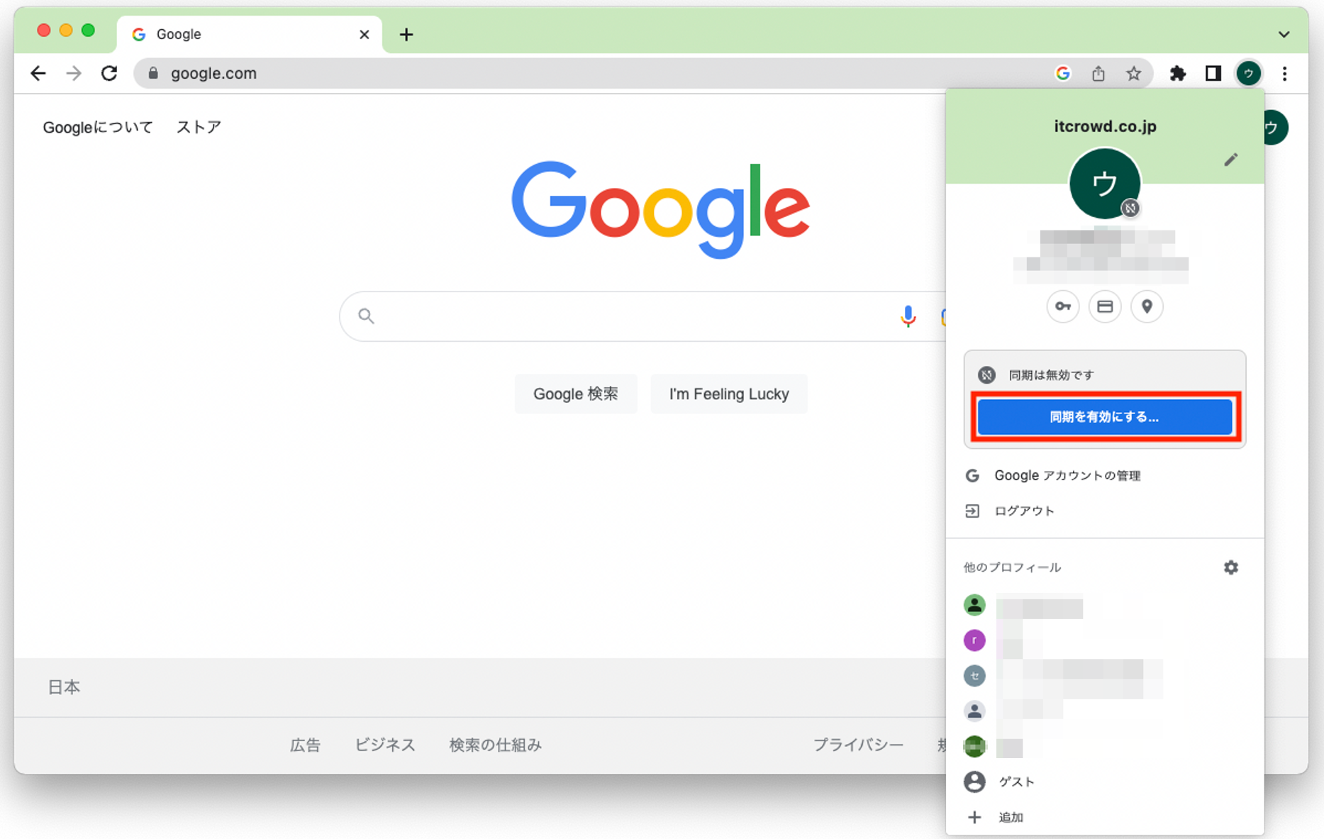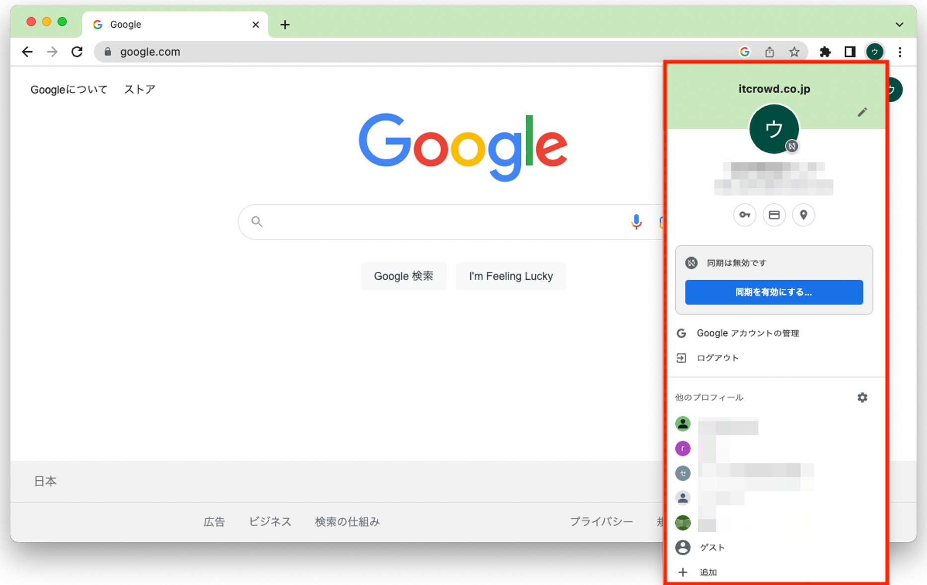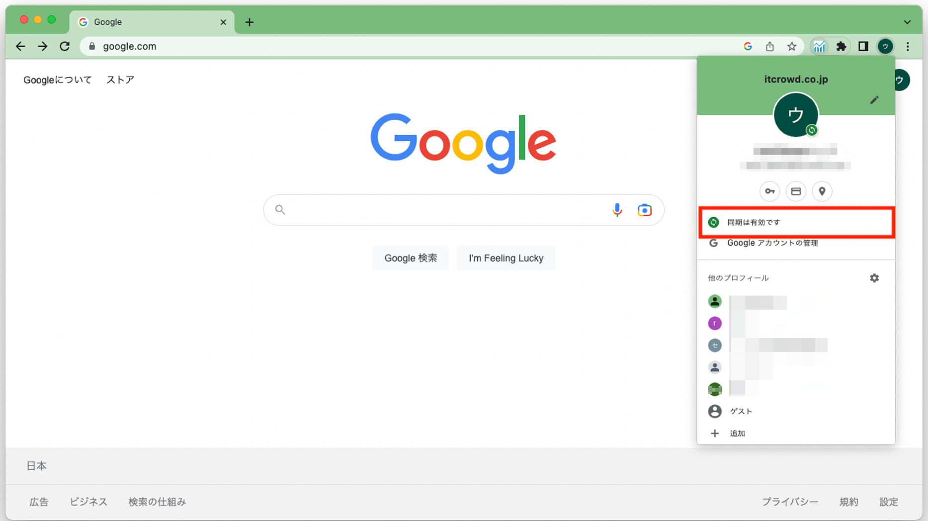 企業で利用しているGoogle Workspace管理下のGoogleアカウントでChromeにログインする。