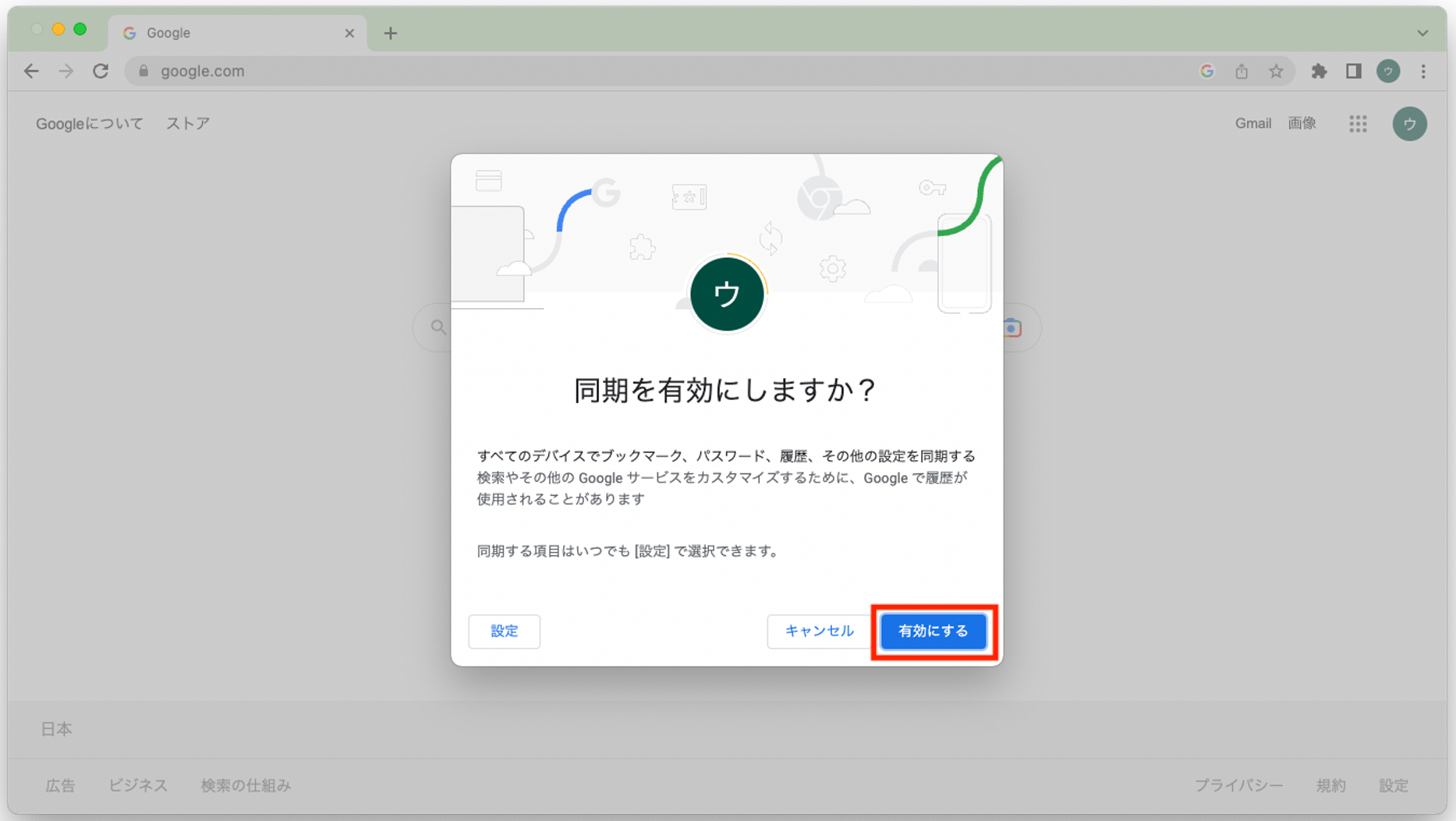 同期を有効にしますか?のダイアログウィンドウが表示されますので[有効にする]ボタンをクリックします。
