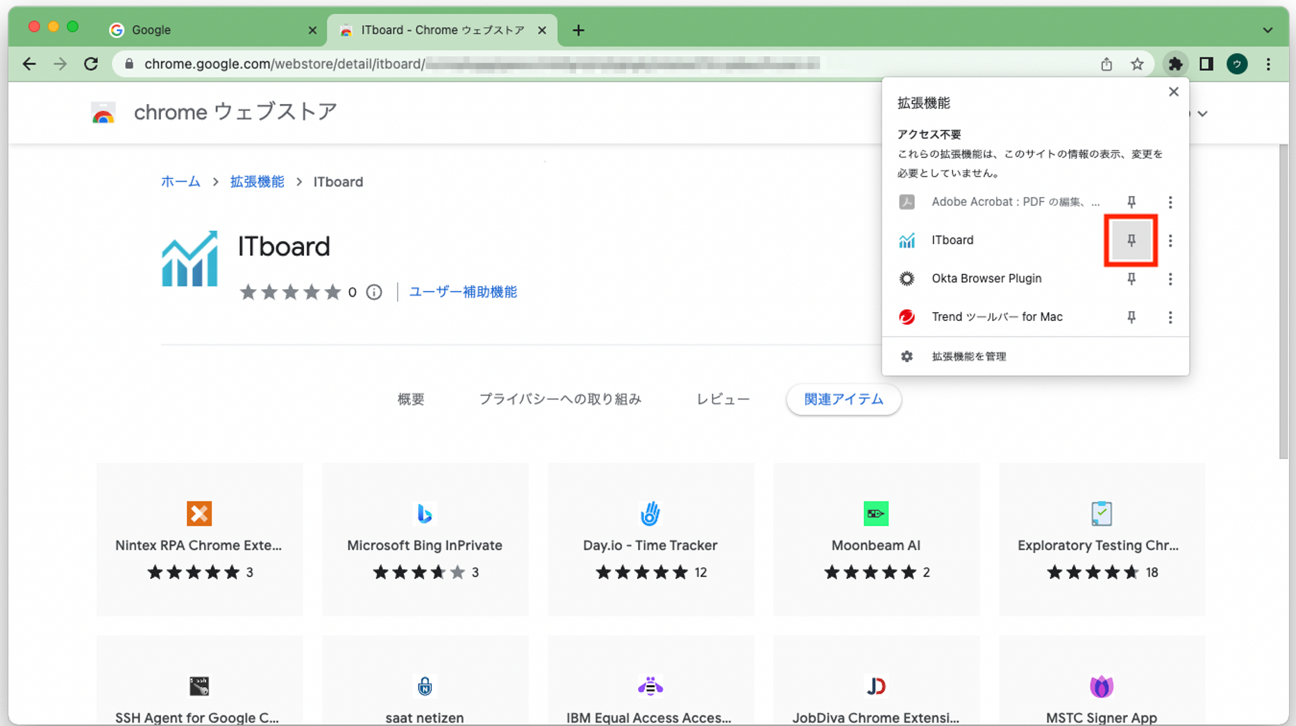拡張機能パネルが開くので、ITboardの右にある「ピン」をクリックします。