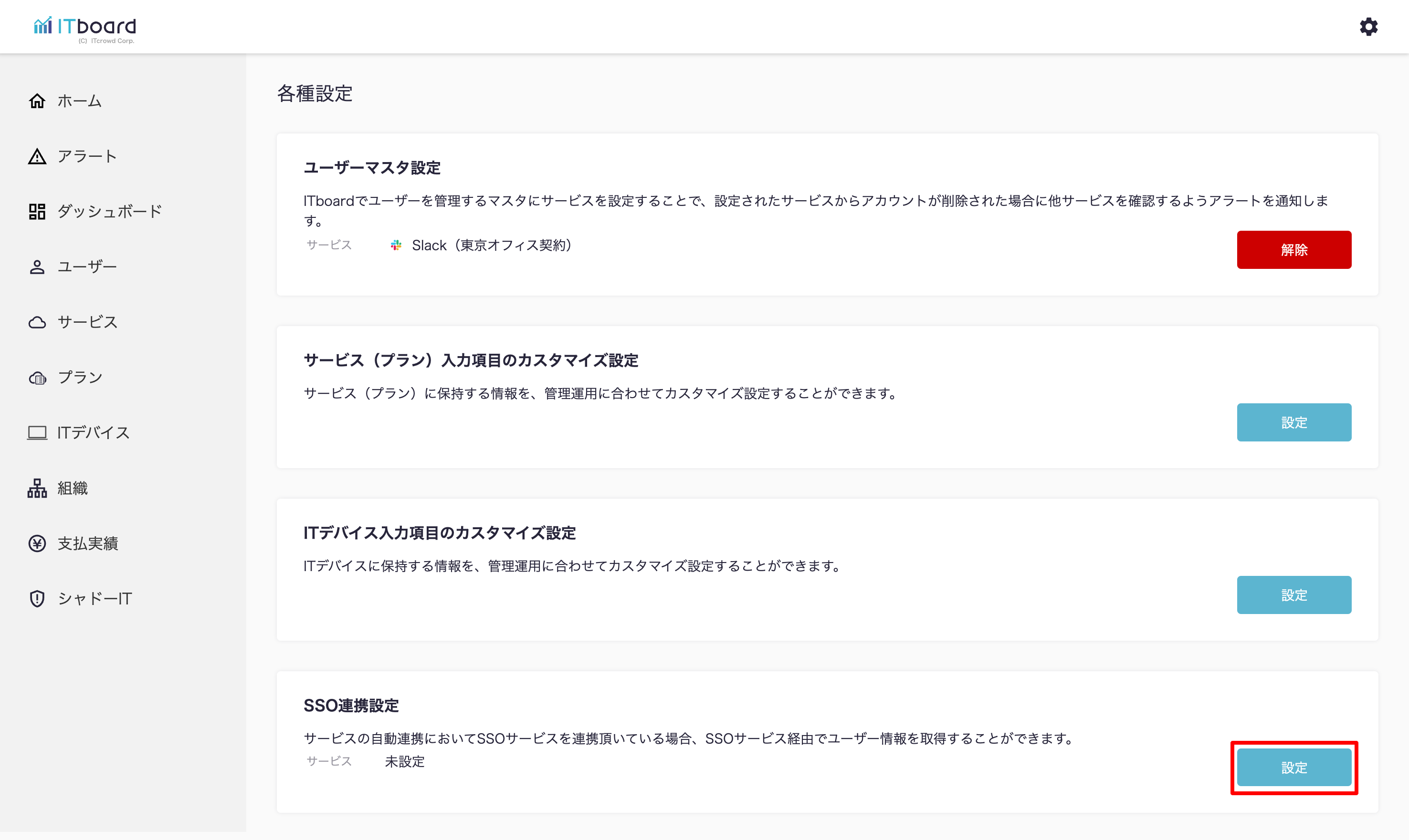 『各種設定』メニューをクリックすると、各種設定画面に遷移します。この画面の下部にある「SSO連携設定」にある『設定』ボタンをクリックします。