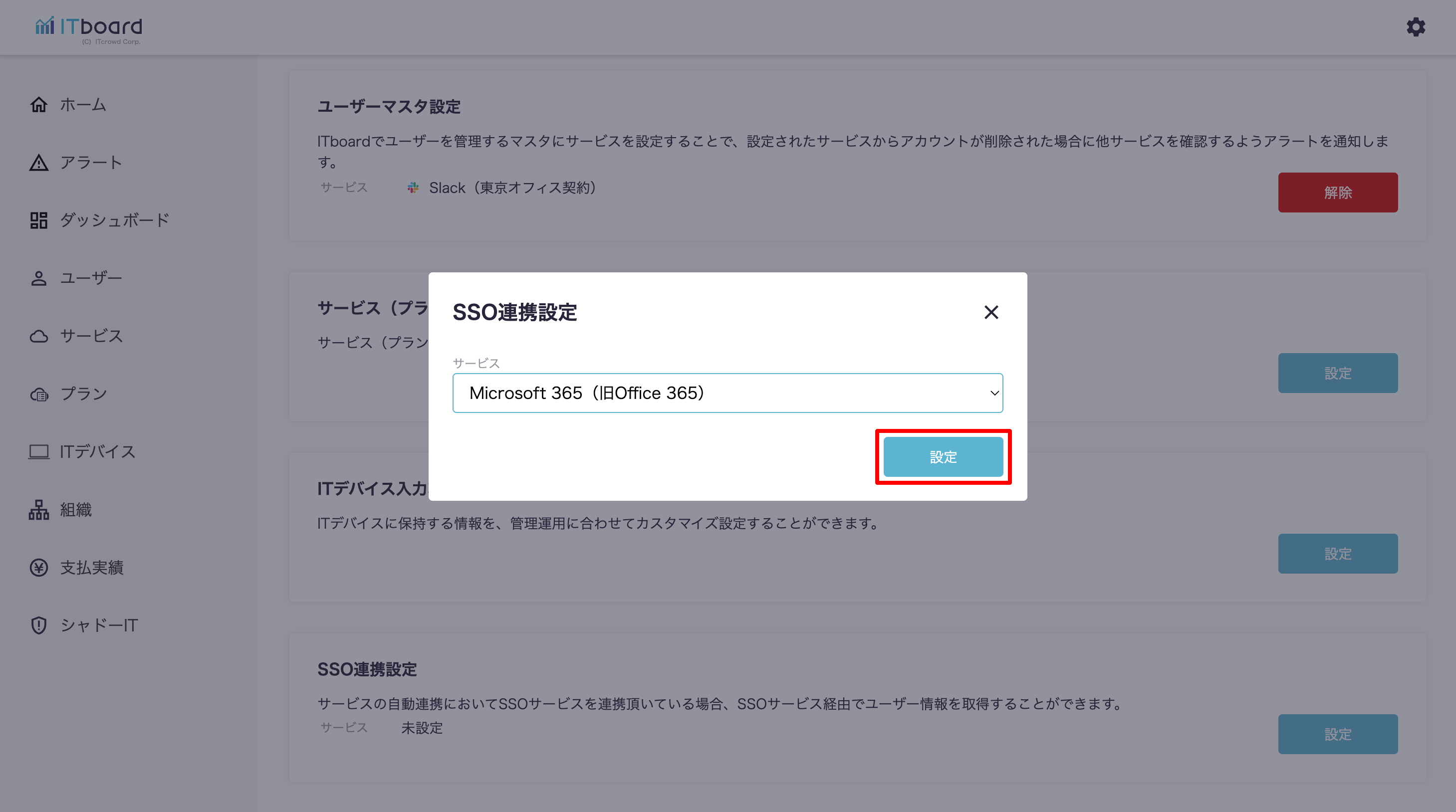 『Microsoft 365(旧Office 365)』を選択し、モーダル右下にある『設定』ボタンをクリックします。SSO連携が開始されます。