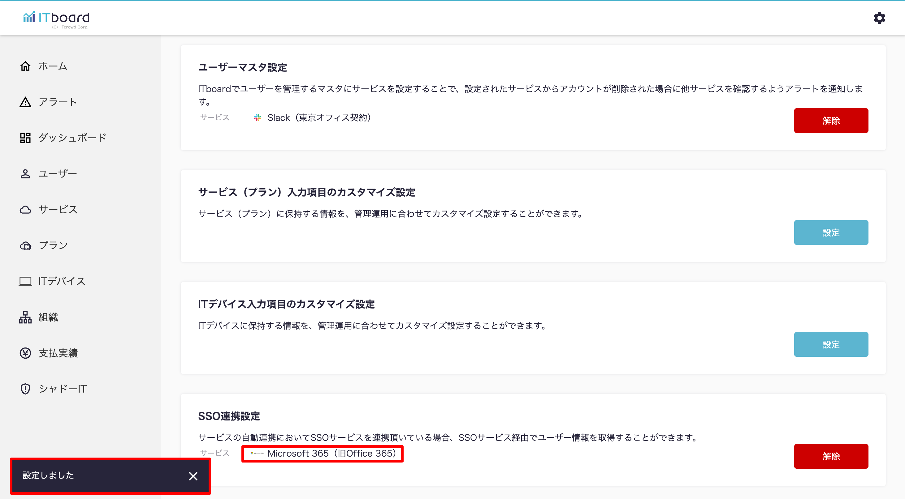 SSO連携が完了すると、各種設定画面に戻り、画面左下に「設定しました」のメッセージが表示されSSO連携が完了します。SSO連携が完了すると、「SSO連携設定」に今SSO連携設定したサービス「Microsoft 365(旧Office 365)」が表示されます。