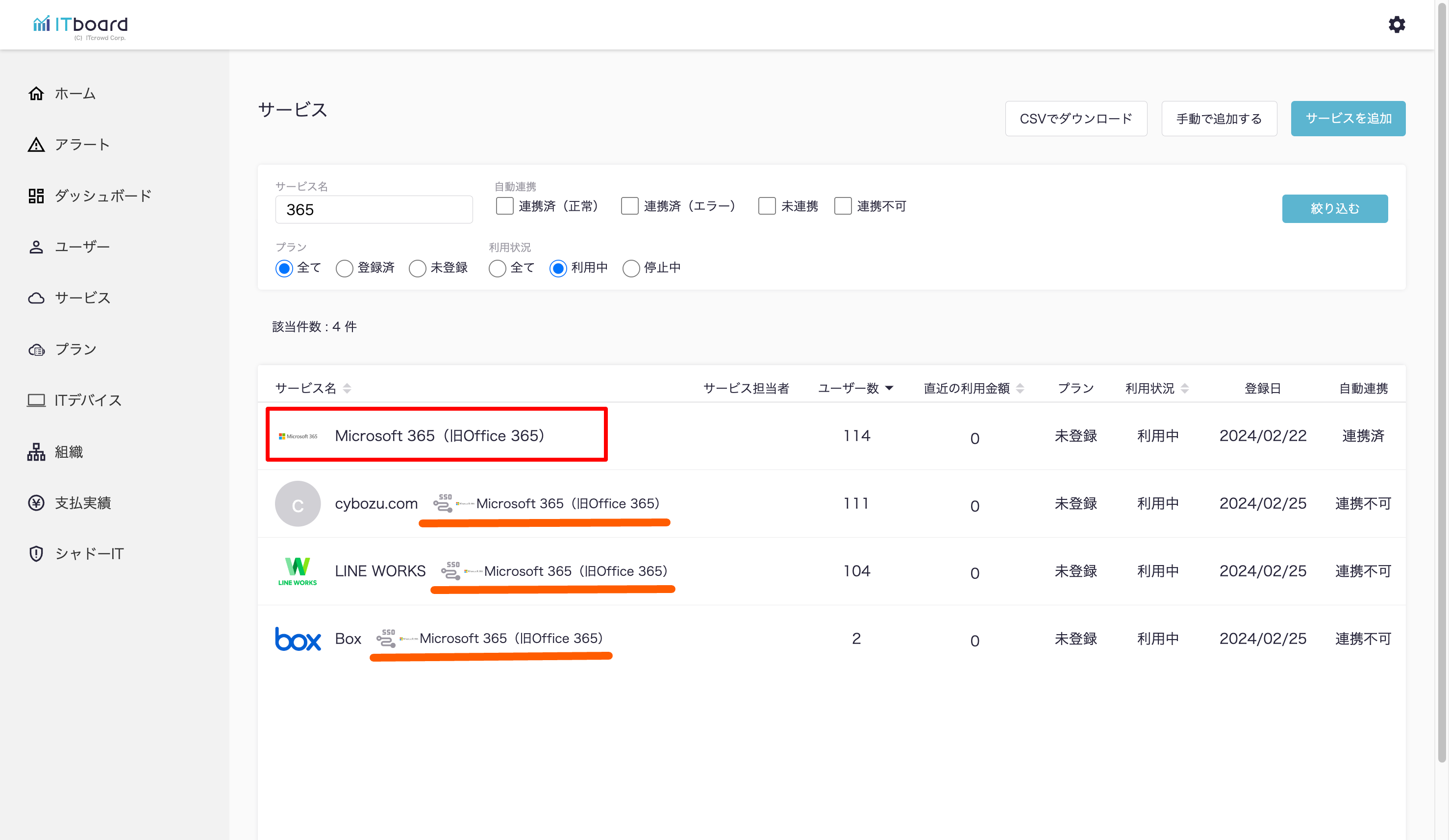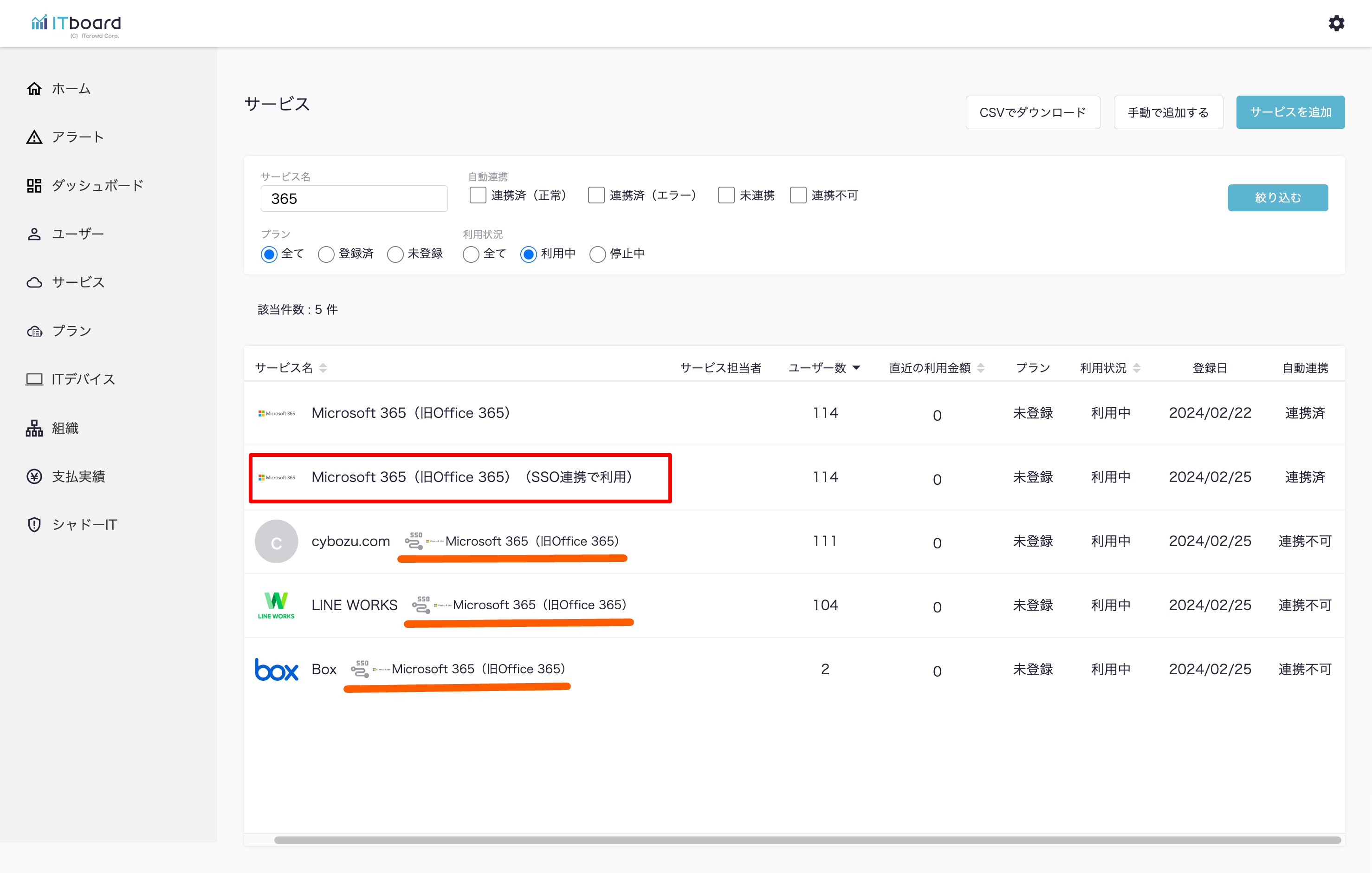 IdPとなっている「Microsoft 365(旧Office 365)」(赤枠内)とMicrosoft 365にSSO設定されたSPとなるサービスが表示されます。(赤アンダーライン)