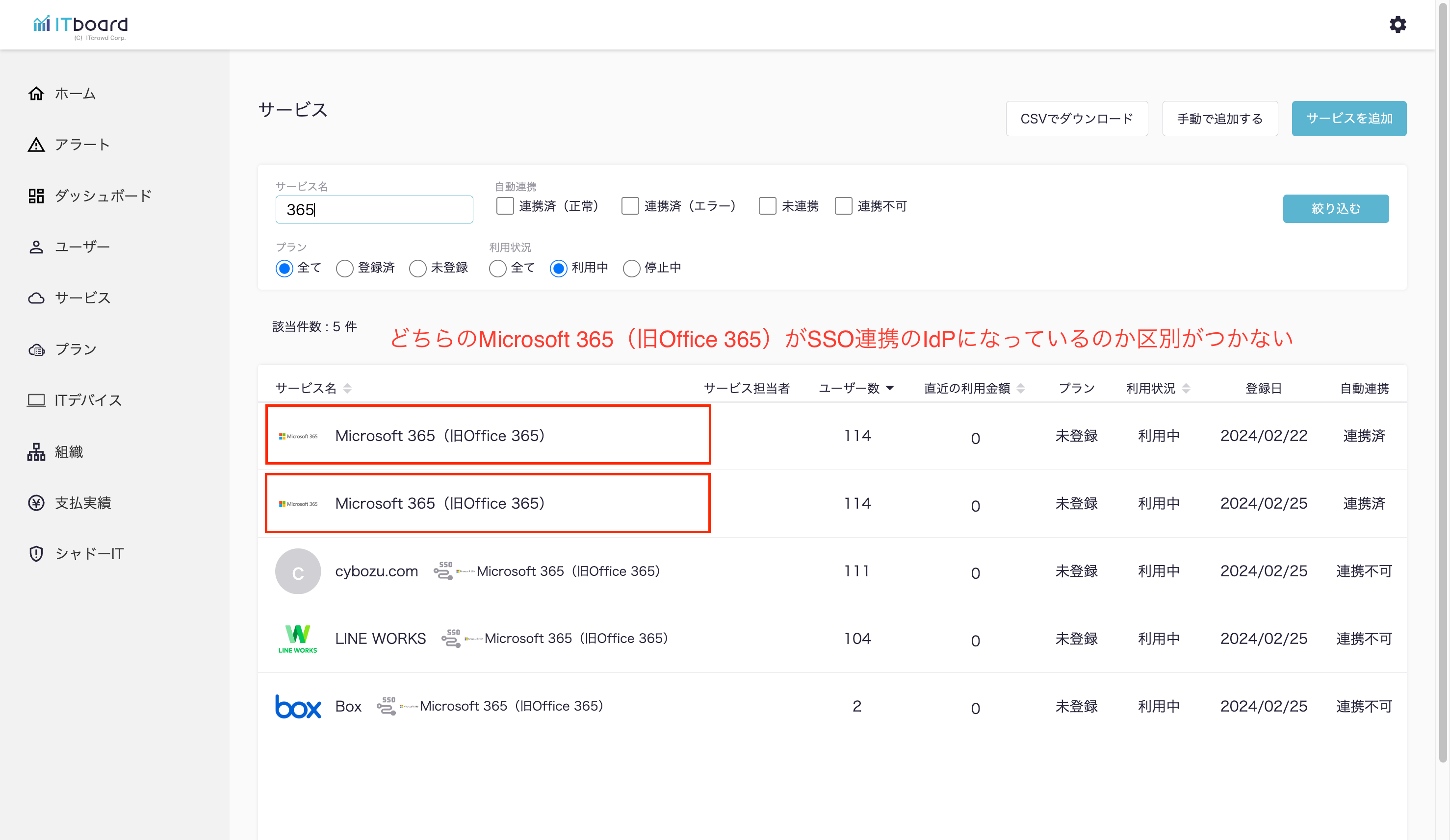 ご利用のITboardで複数のMicrosoft 365(旧Office 365)を追加・連携していると、どちらのMicrosoft 365(旧Office 365)がSSO連携のIdPになっているのか区別がつかなくなります。