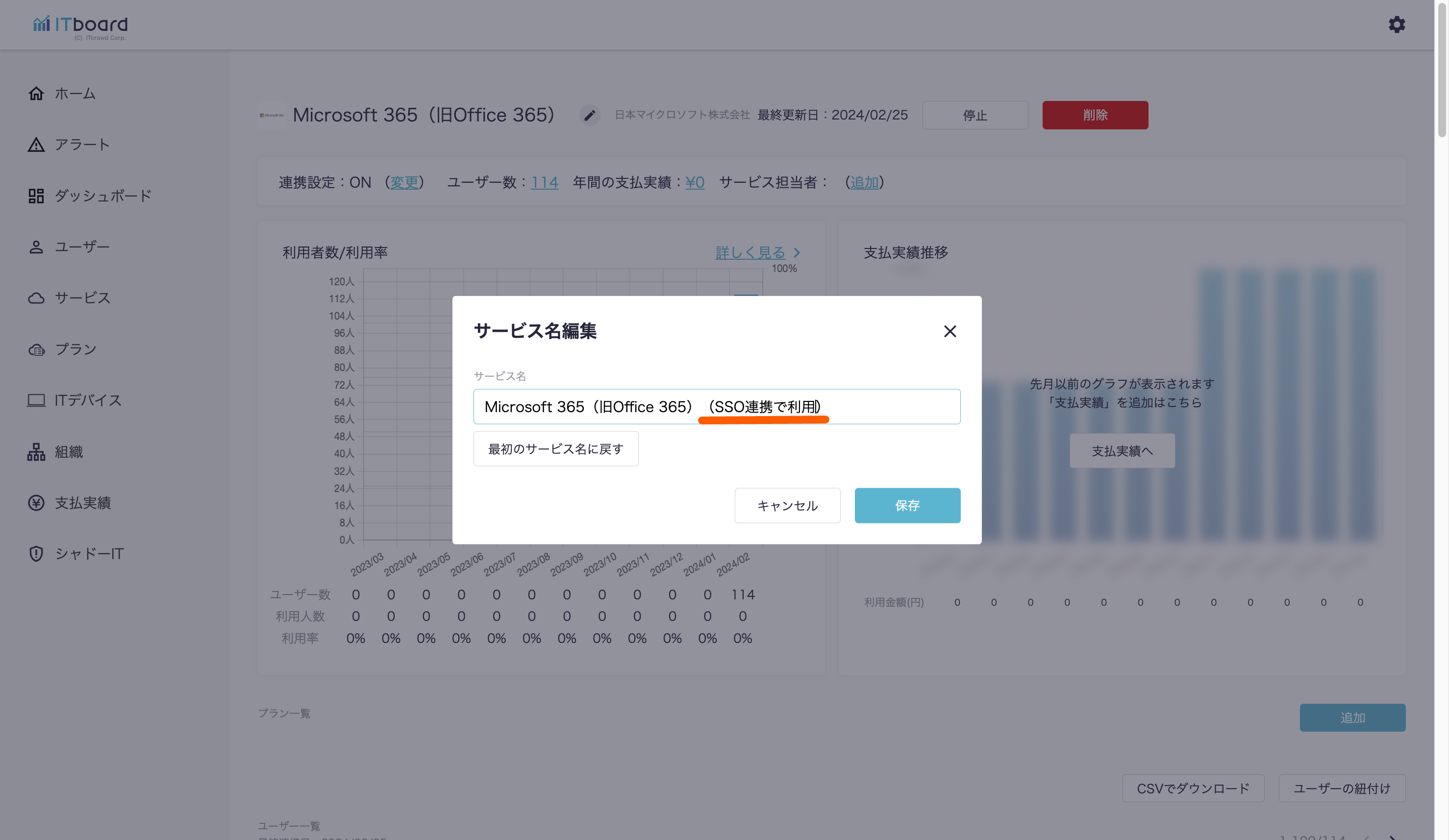 サービス名を変更する「鉛筆」アイコンをクリックすると、サービス名編集モーダルが表示されます。サービス名欄に追加入力としてSSO連携設定に使うMicrosoft 365を区別できるように「(SSO連携で利用)」と追加入力して、モーダル右下の『保存』ボタンをクリックします。