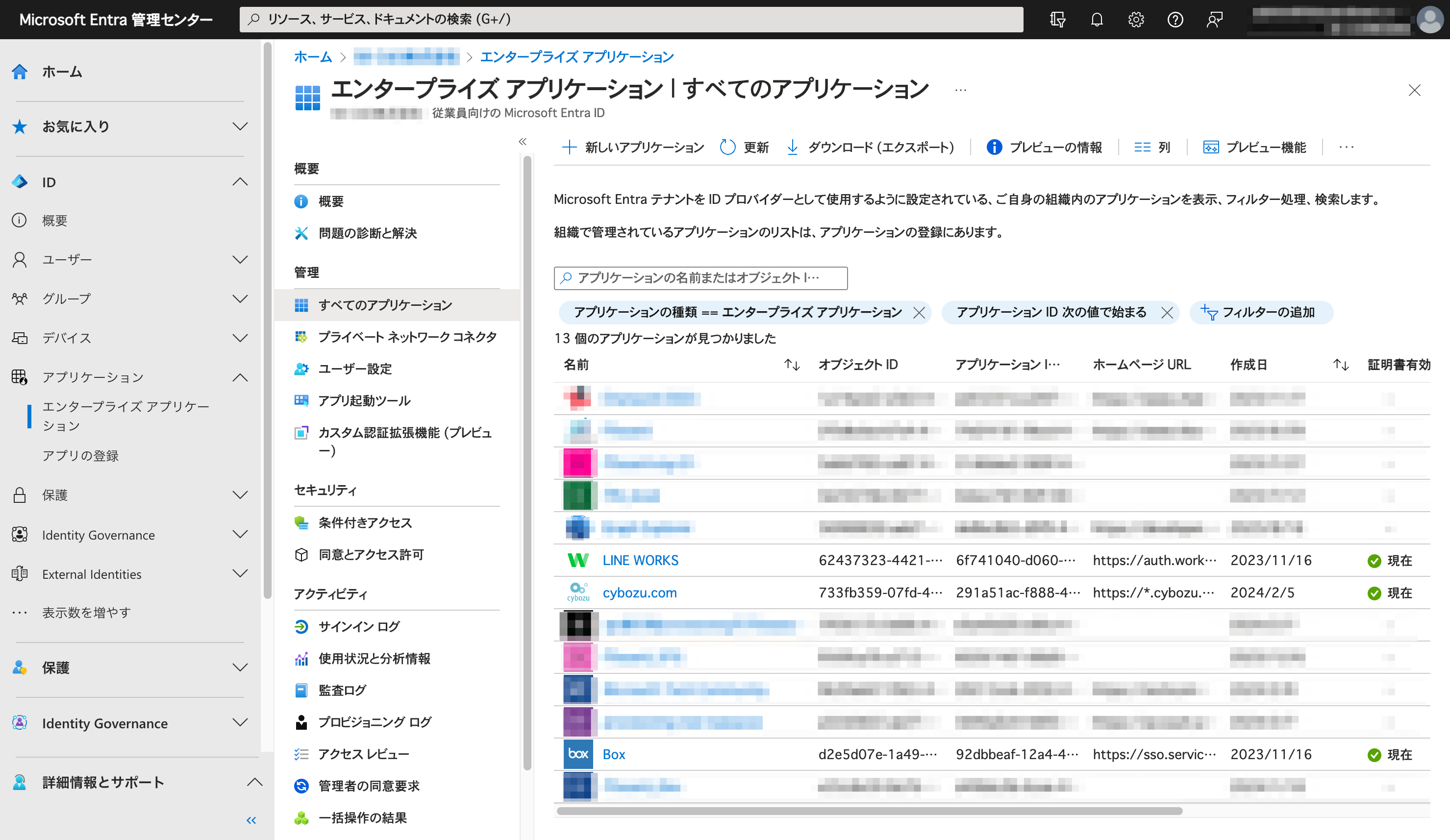 例:Microsoft 365(Entra ID(旧名称:Azure AD))をIdPにしてエンタープライズアプリケーション画面でLINE WORKS、cybozu.com、BoxをSPとして設定している画面