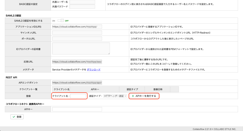 「クライアント名」に適当な値を入力し、「APIキーを発行する」から発行する。