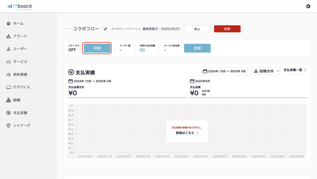 2. サービス詳細画面の「同期」をクリックする。