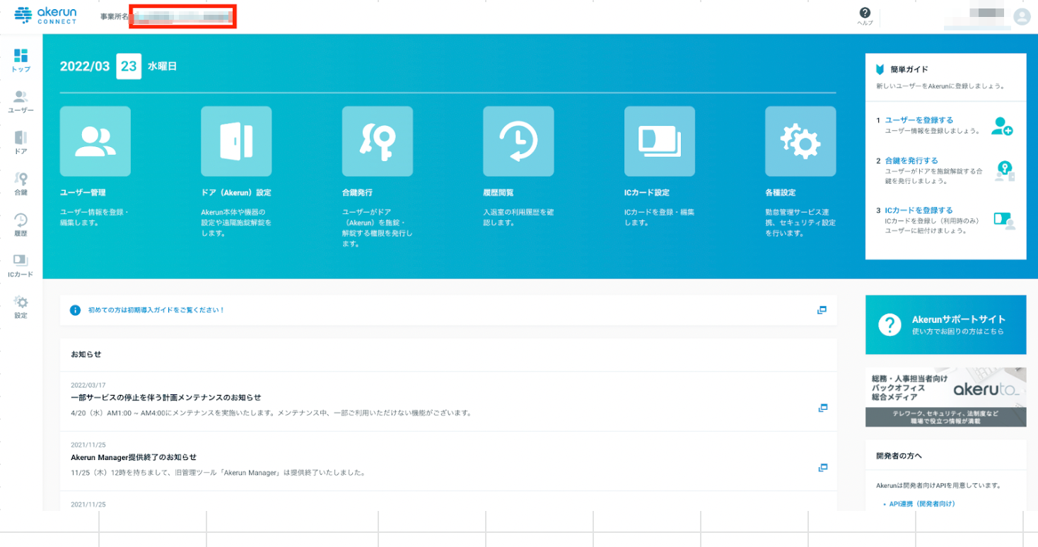 Akerunダッシュボードにログインし、画面上部の事業所名をコピーし保管します。
