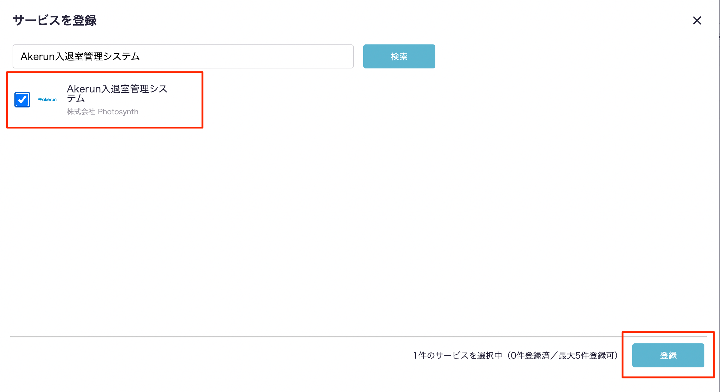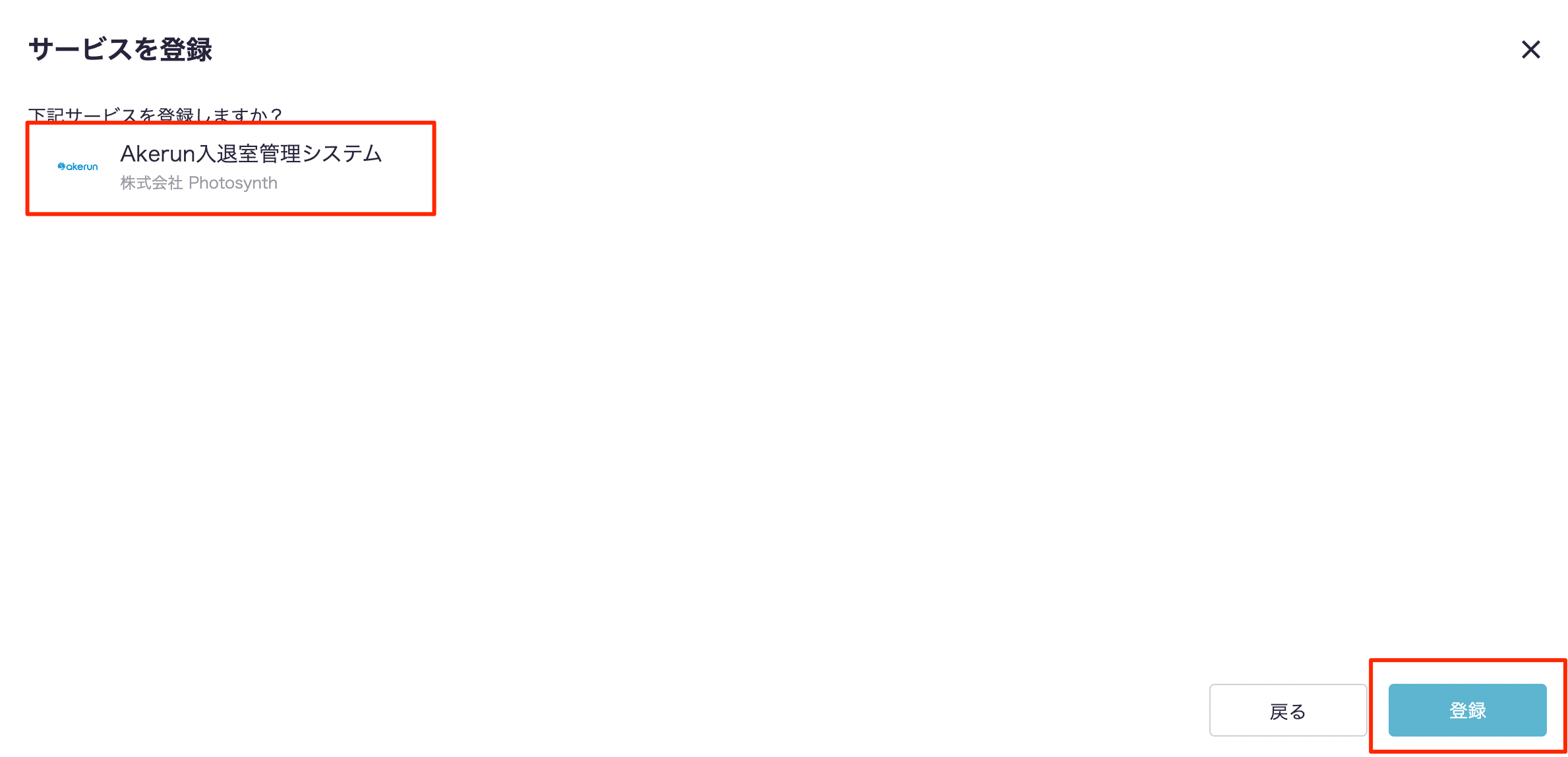 その後、下画像のようなモーダルが出現しますので、入力欄にサービス名である「Akerun」と入力します。