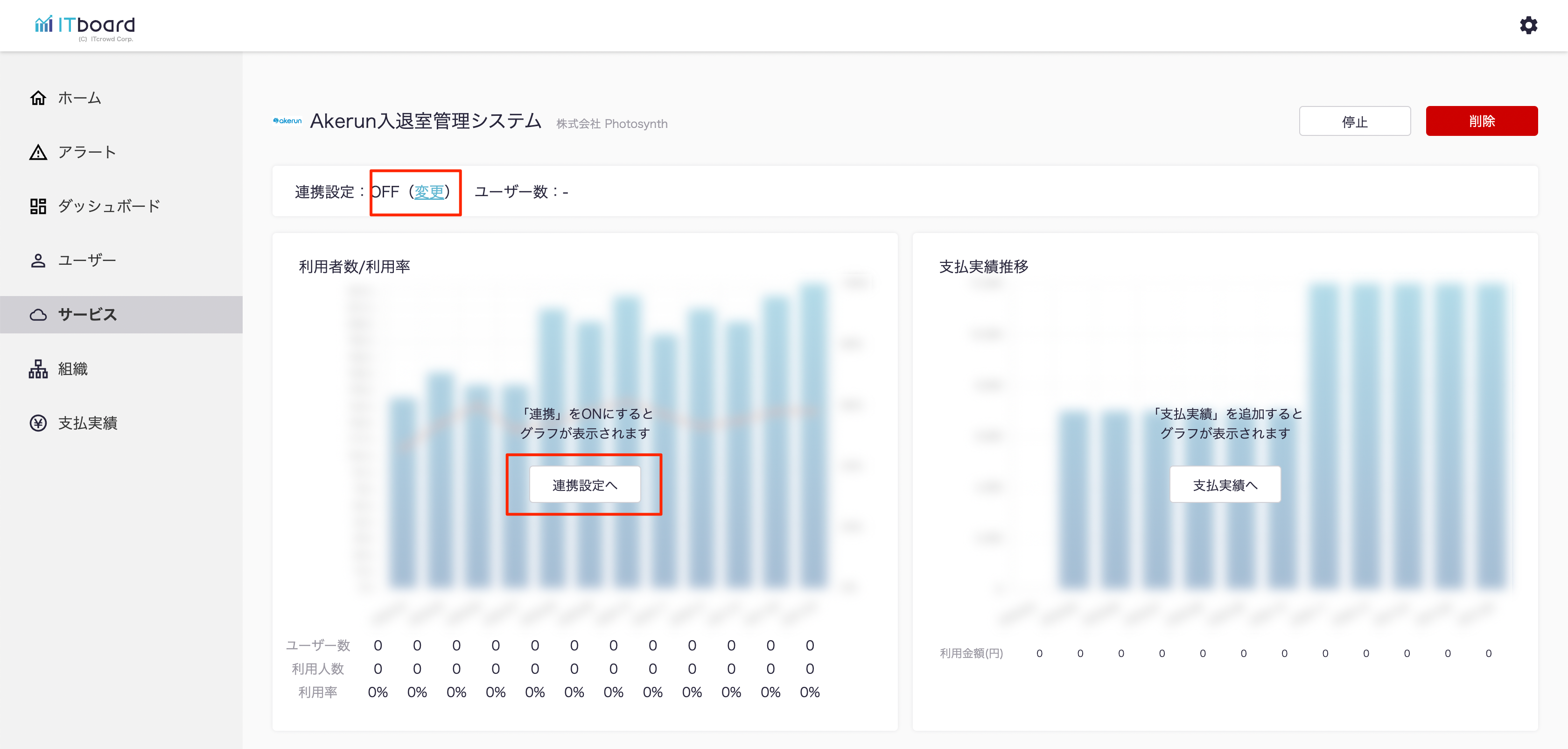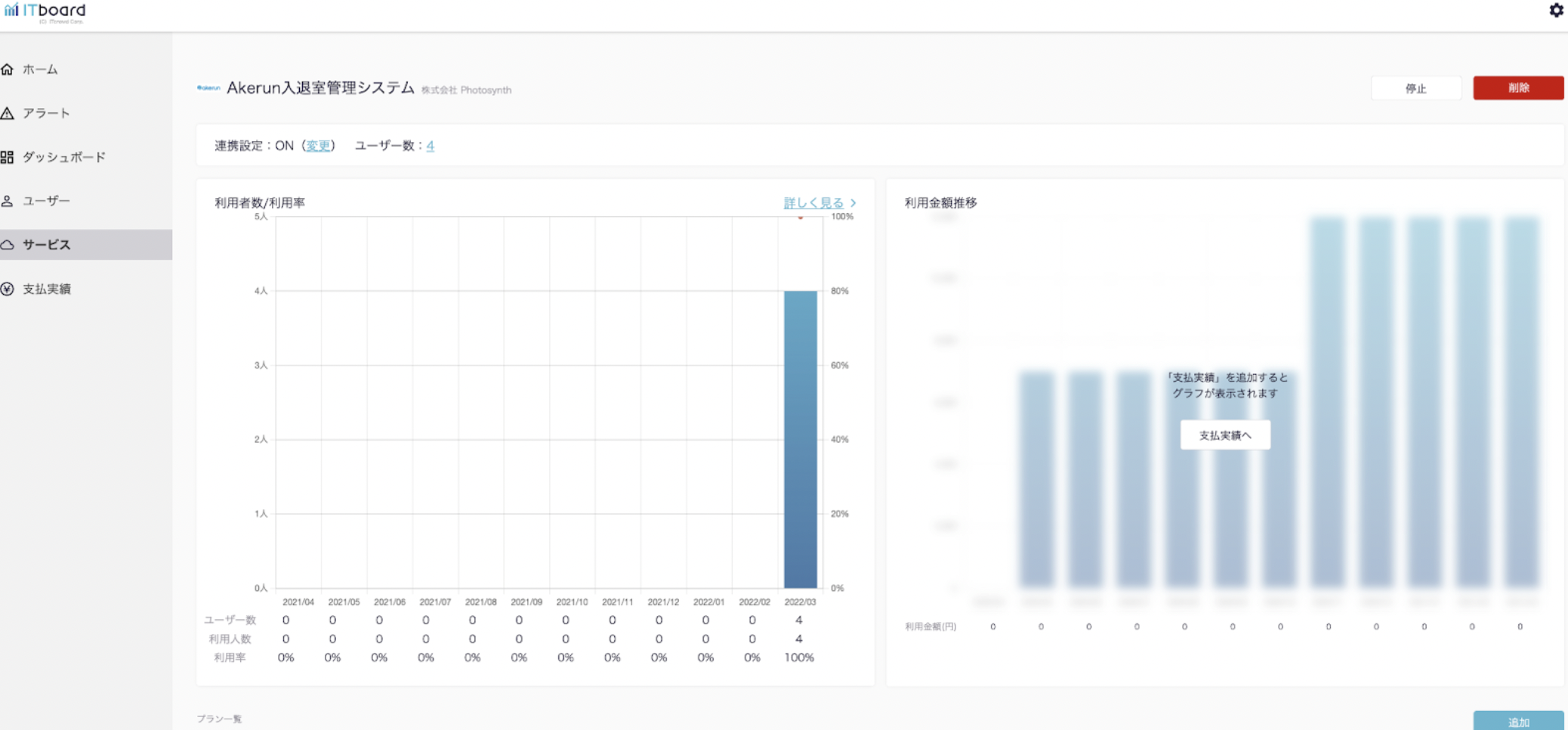 ITboardのサービス詳細画面に戻りますので、そこで「連携設定: ON」になり、「利用者数/利用率」のグラフが見られるようになっていれば、連携成功です。