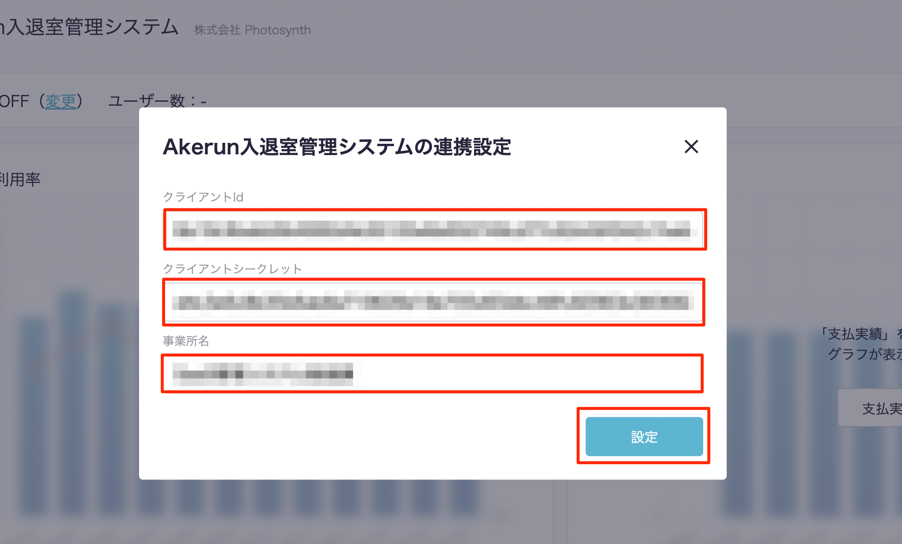 Akerunの連携設定モーダルが出現するので、「クライアントId」と「クライアントシークレット」と「事業所名」を入力し『設定』ボタンを押下します。