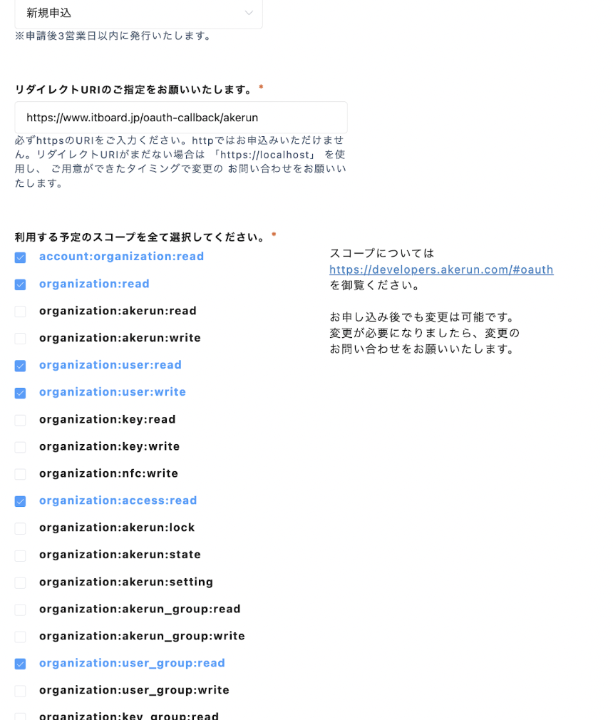 『申込種別』に「新規申し込み」、『リダイレクトURL』に「https://www.itboard.jp/oauth-callback/akerun」を入力します。