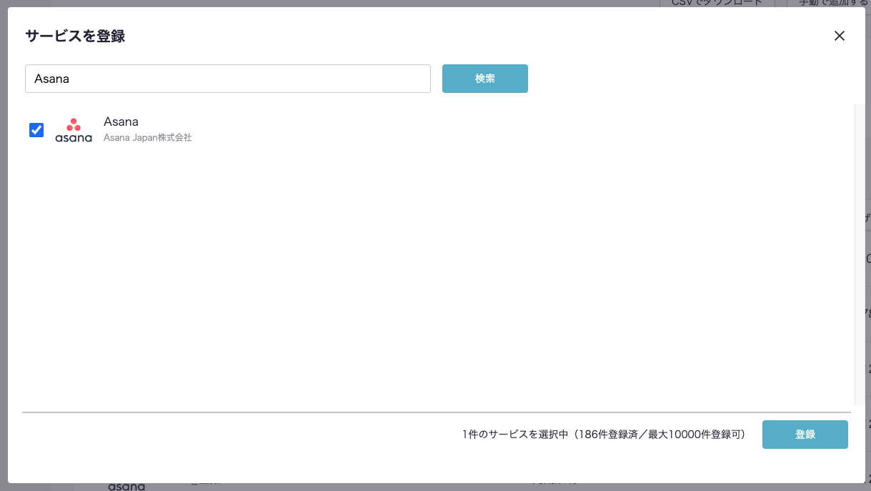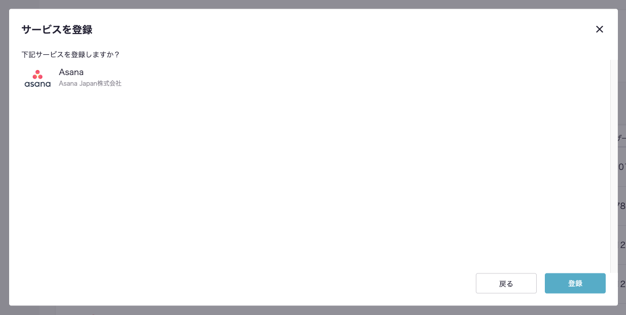 その後、下画像のようなモーダルが出現しますので、入力欄にサービス名である「Asana」と入力します。