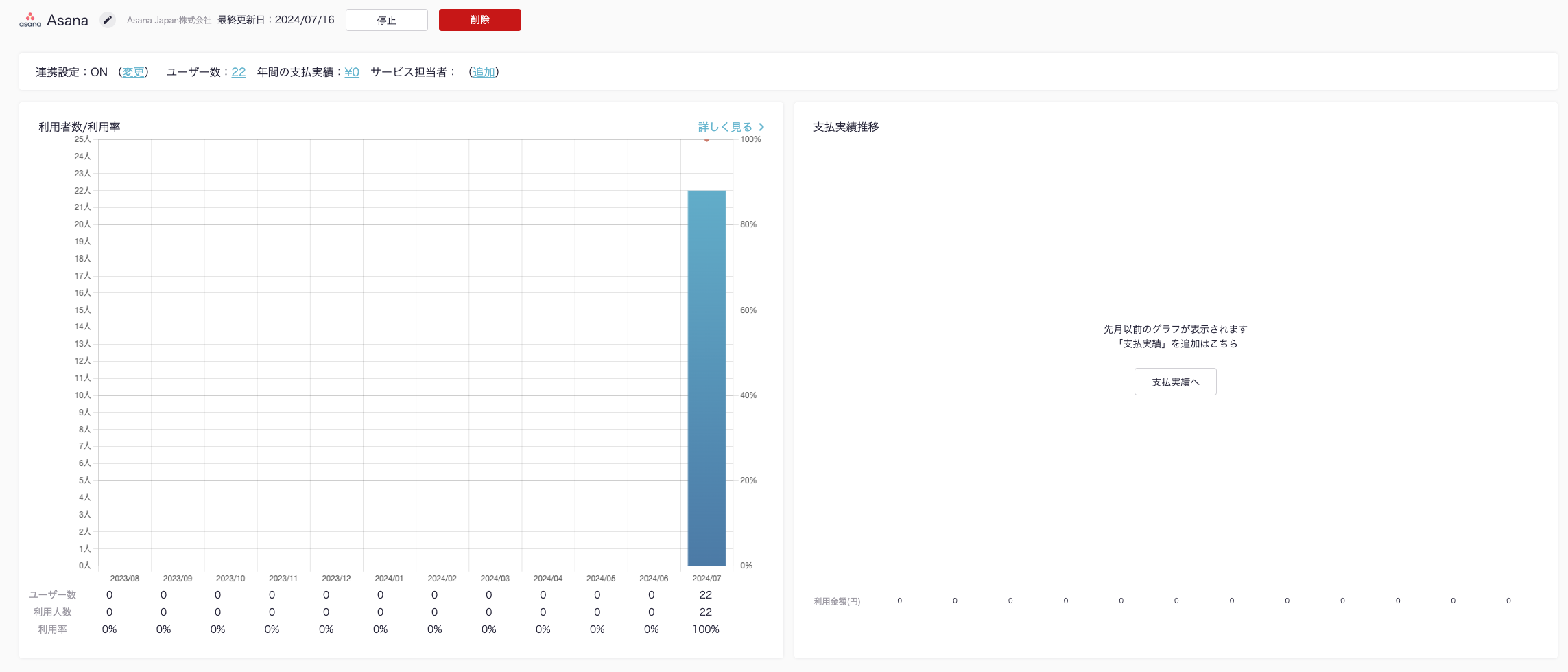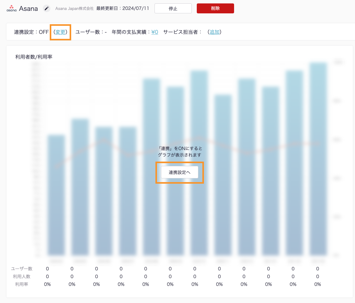 ITboardのサービス詳細画面に戻りますので、そこで「連携設定: ON」になり、「利用者数/利用率」のグラフが見られるようになっていれば、連携成功です。