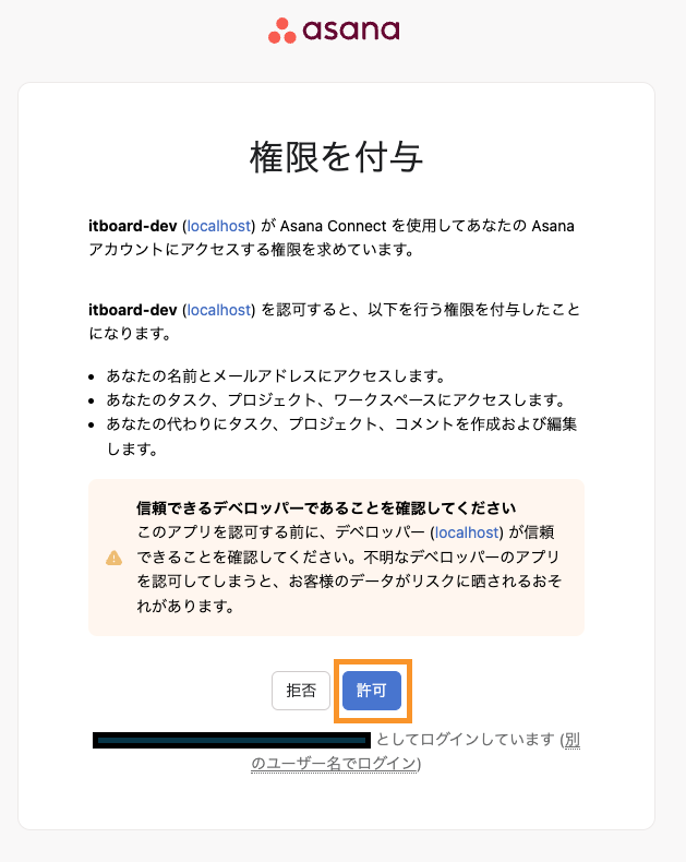 Asanaへログイン後『許可』ボタンを押下します。
