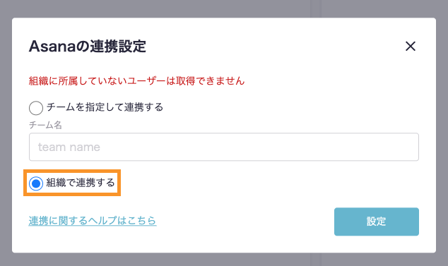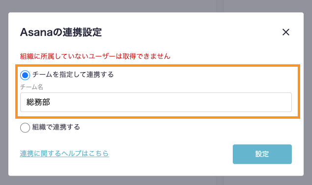 『チームを指定して連携する』をチェック後、チーム名を入力し『設定』ボタンを押下します。