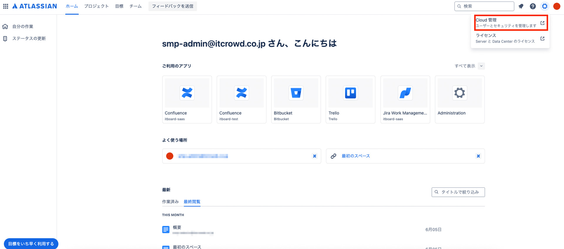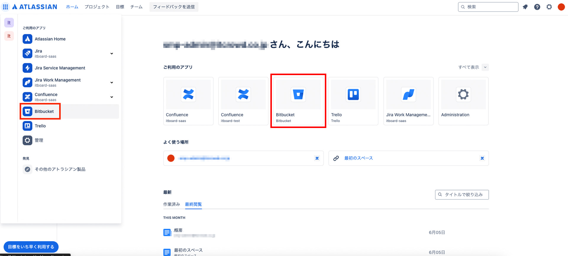 1.AtlassianにログインをするでログインしたAtlassianの管理画面ホームの、『ご利用のアプリ』から『Bitbucket』を選択します。