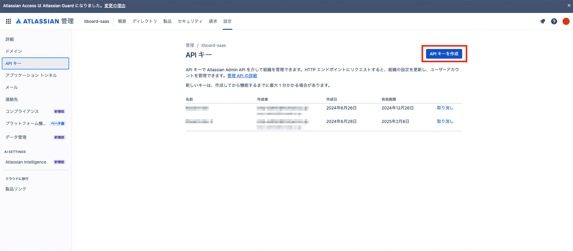 『設定』 > 『APIキー』を選択していただくと『APIキーを作成』というボタンがありますので、こちらを押下してAPIキーを作成します。