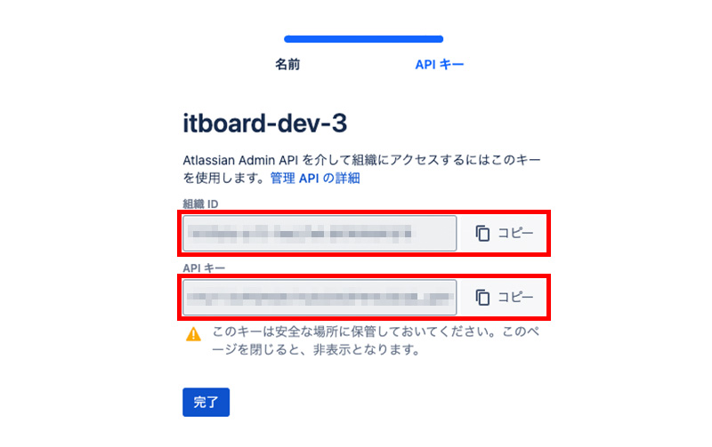 APIキーを作成後、表示される「組織ID」と「APIキー」が表示されるのでコピーをして保管します。