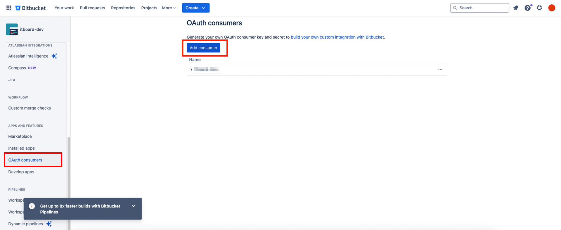 3.Bitbucketの管理画面でOAuth設定を行う」の手順で開いていたBitbucketの管理画面を開きます。