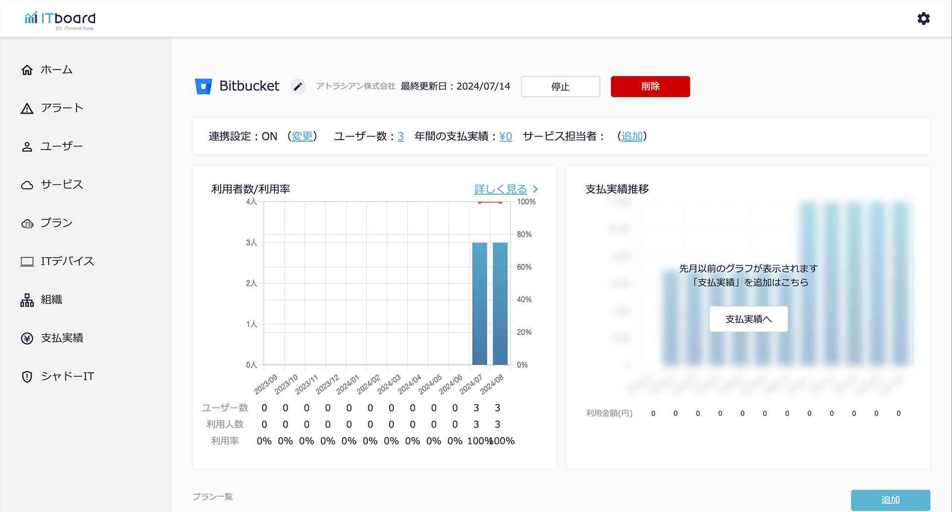 ITboardのサービス詳細画面に戻りますので、そこで「連携設定: ON」になり、「利用者数/利用率」のグラフが見られるようになっていれば、連携成功です。