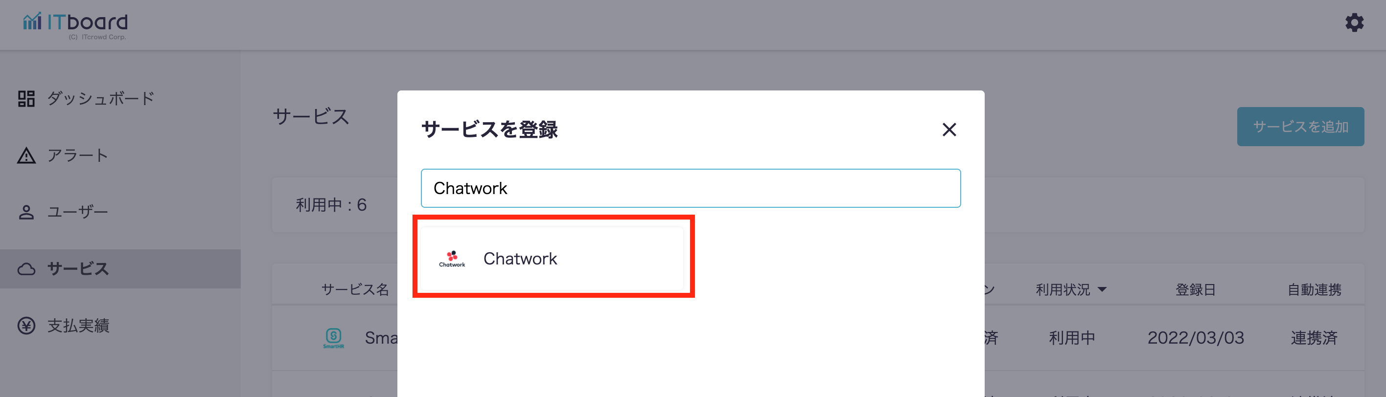 1.ITboardでサービス選択からChatworkを追加する