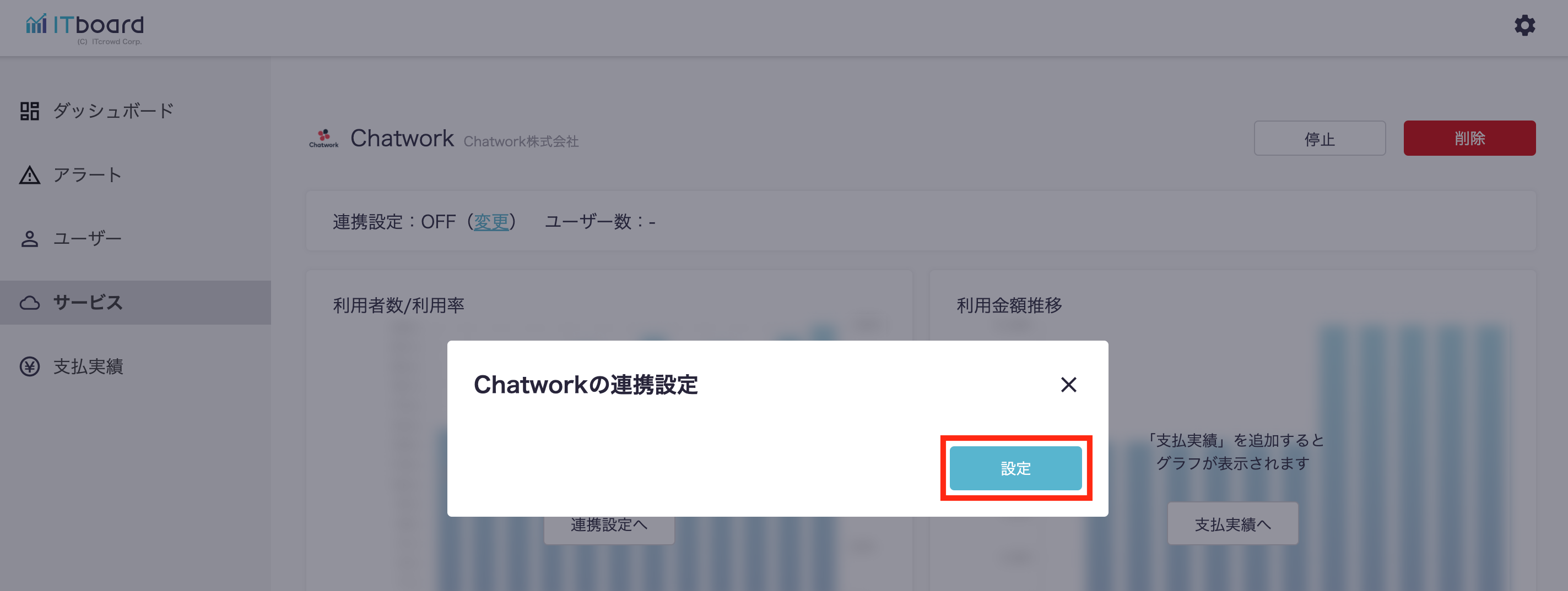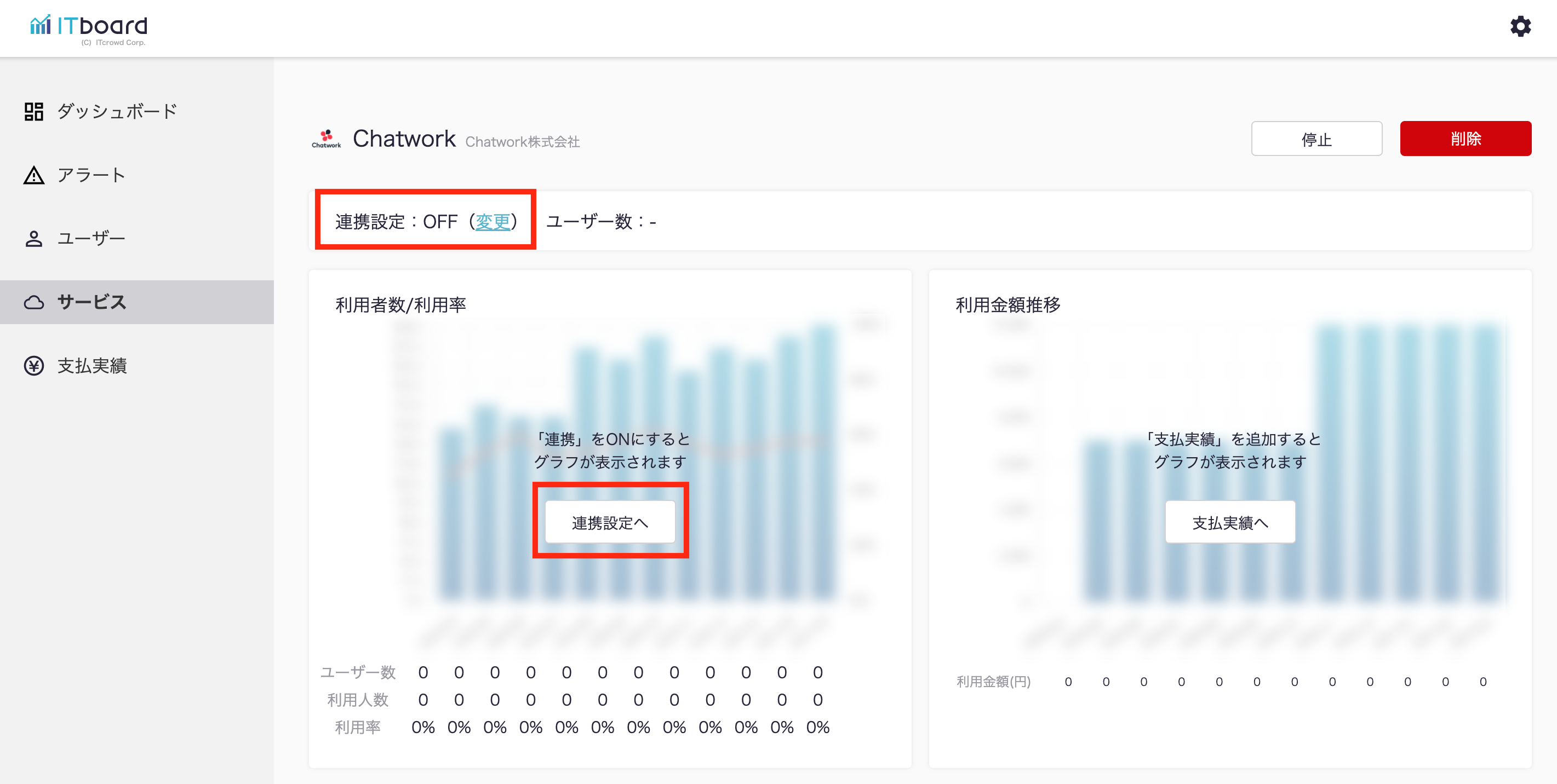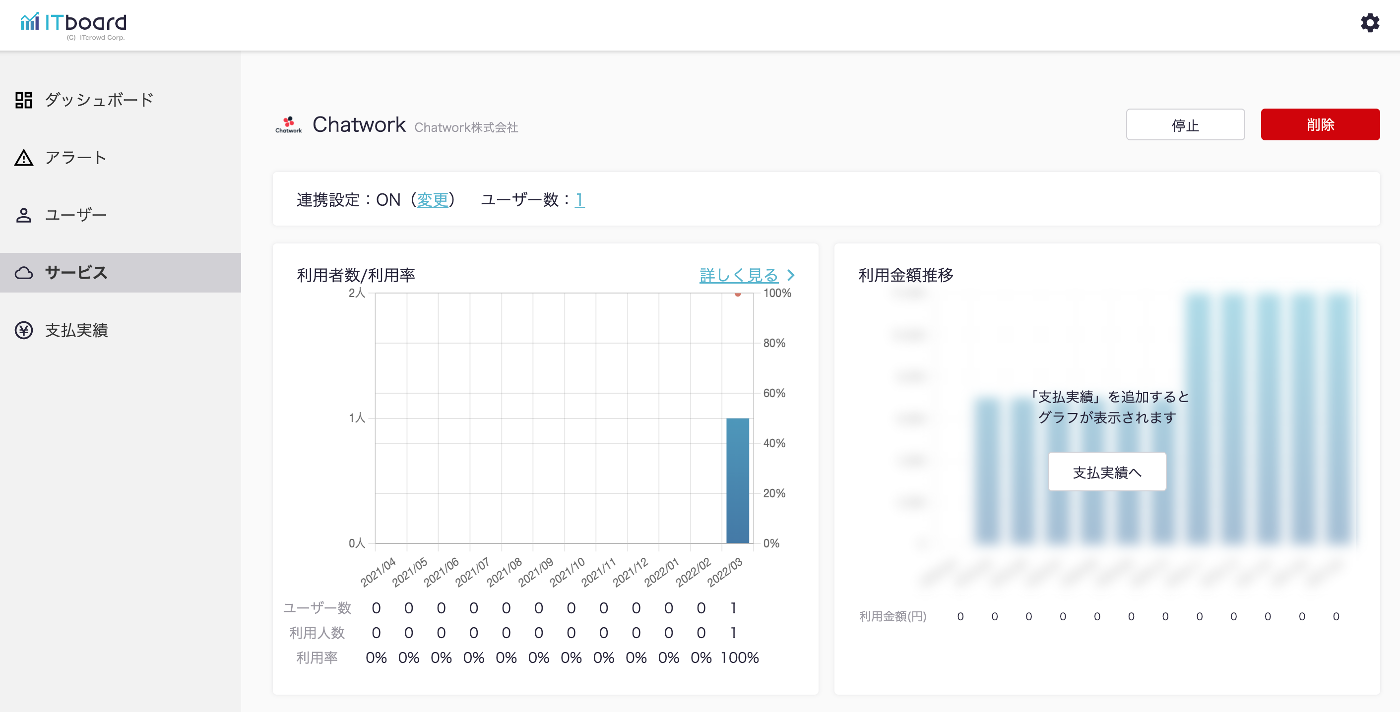 ITboardのサービス詳細画面に戻りますので、そこで「連携設定: ON」になり、「利用者数/利用率」のグラフが見られるようになっていれば、連携成功です。