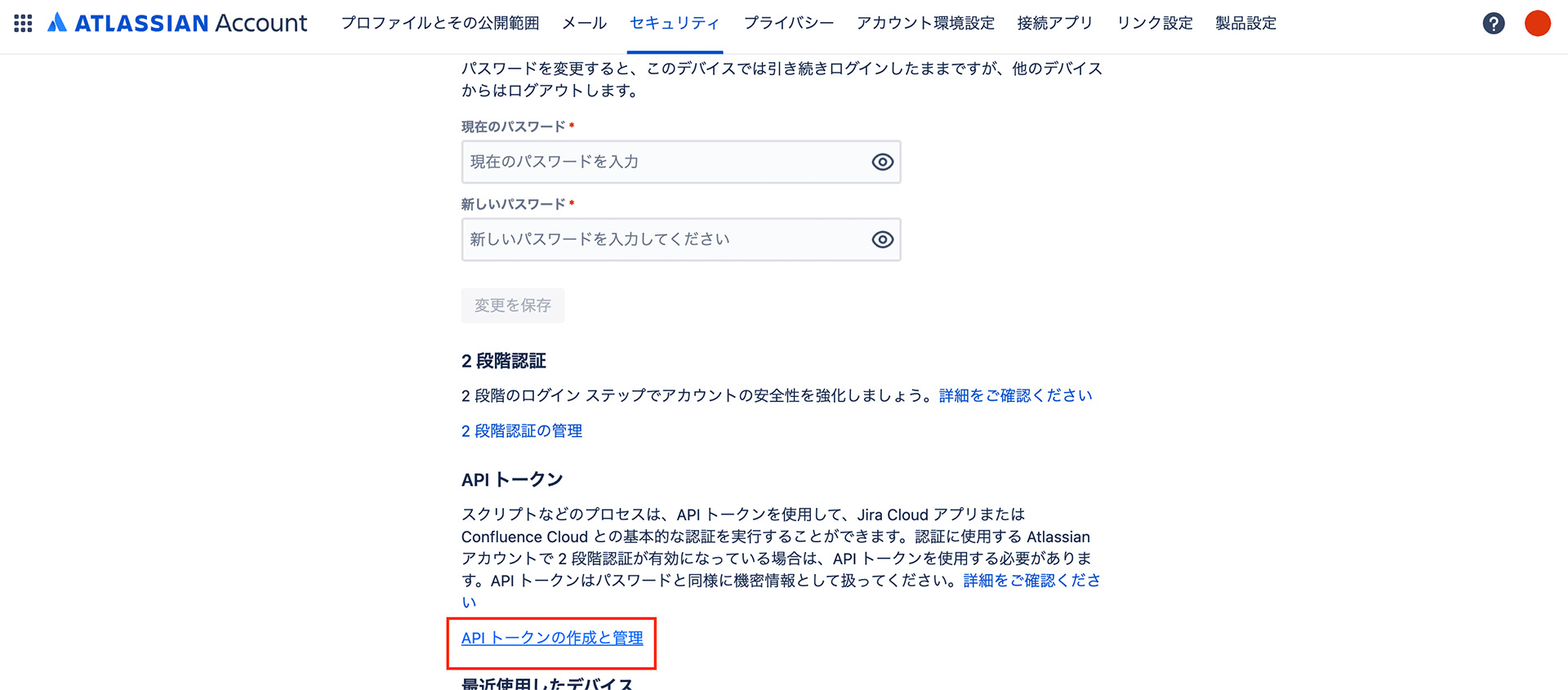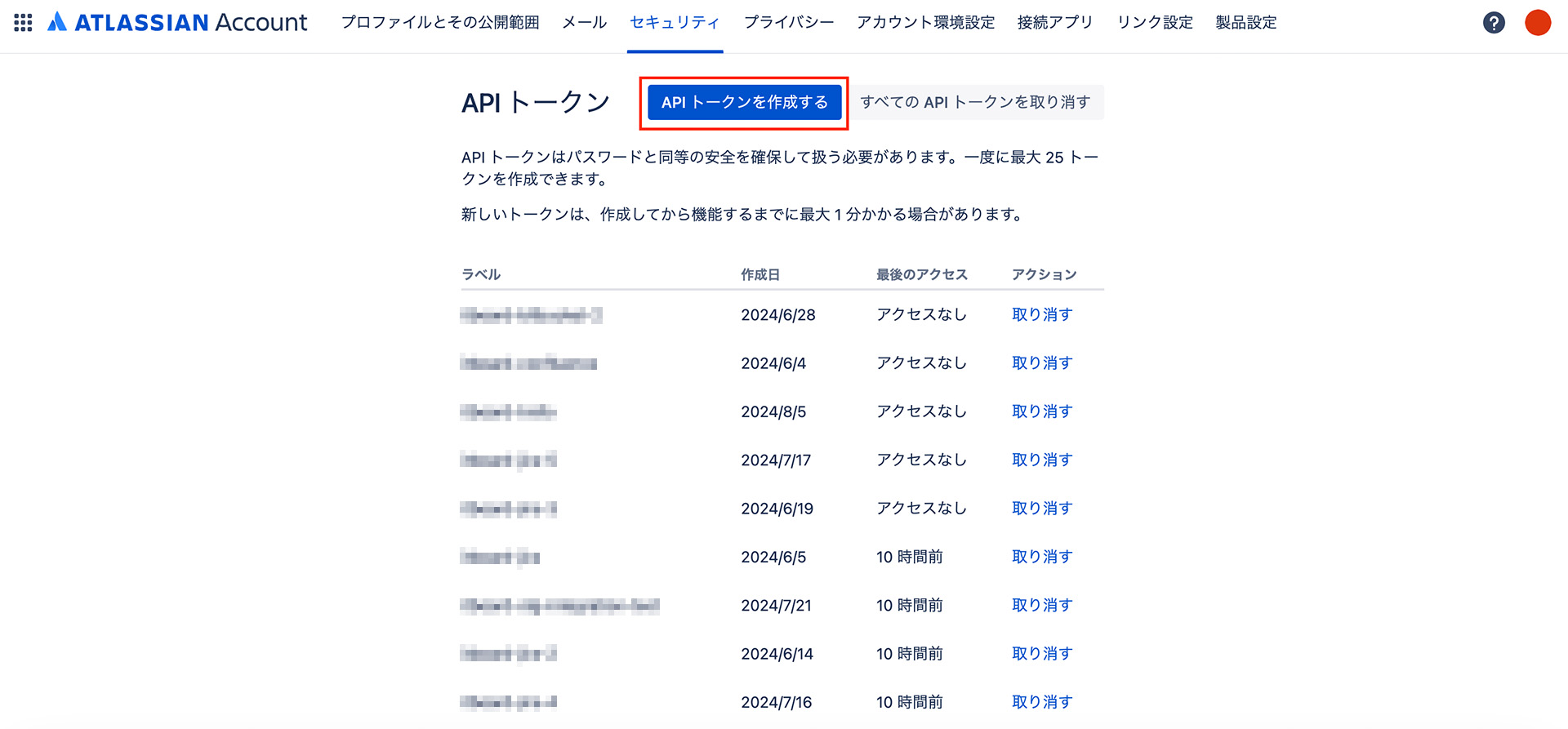 『セキュリティ』 > 『APIトークンの作成と管理』を押下します。