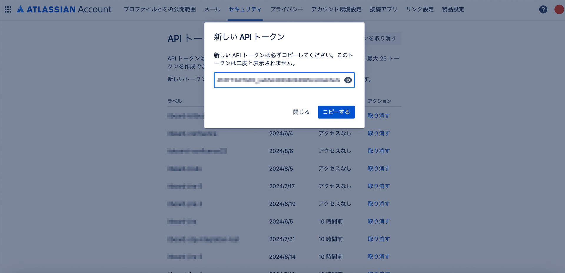 『APIトークンを作成する』ボタンを押下するとモーダルが開き、「APIトークン」が表示されるのでコピーをして保管します。