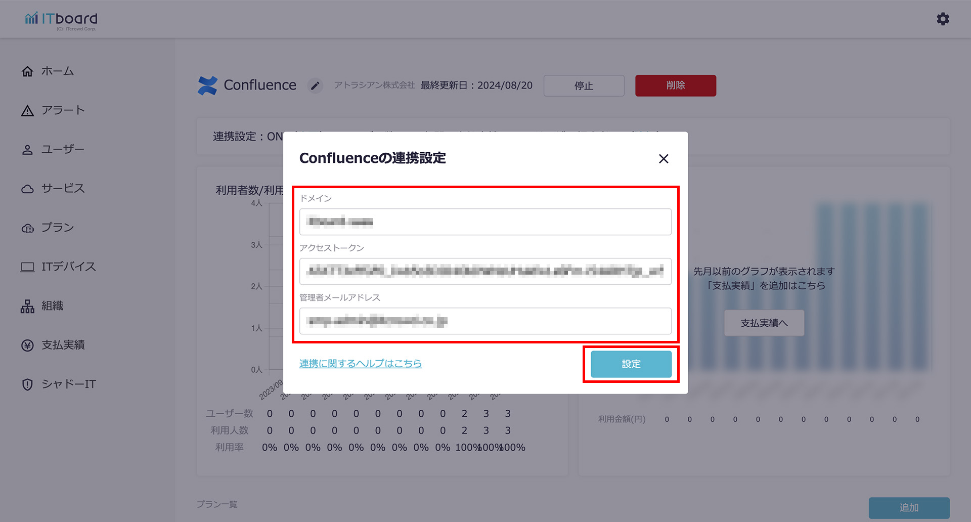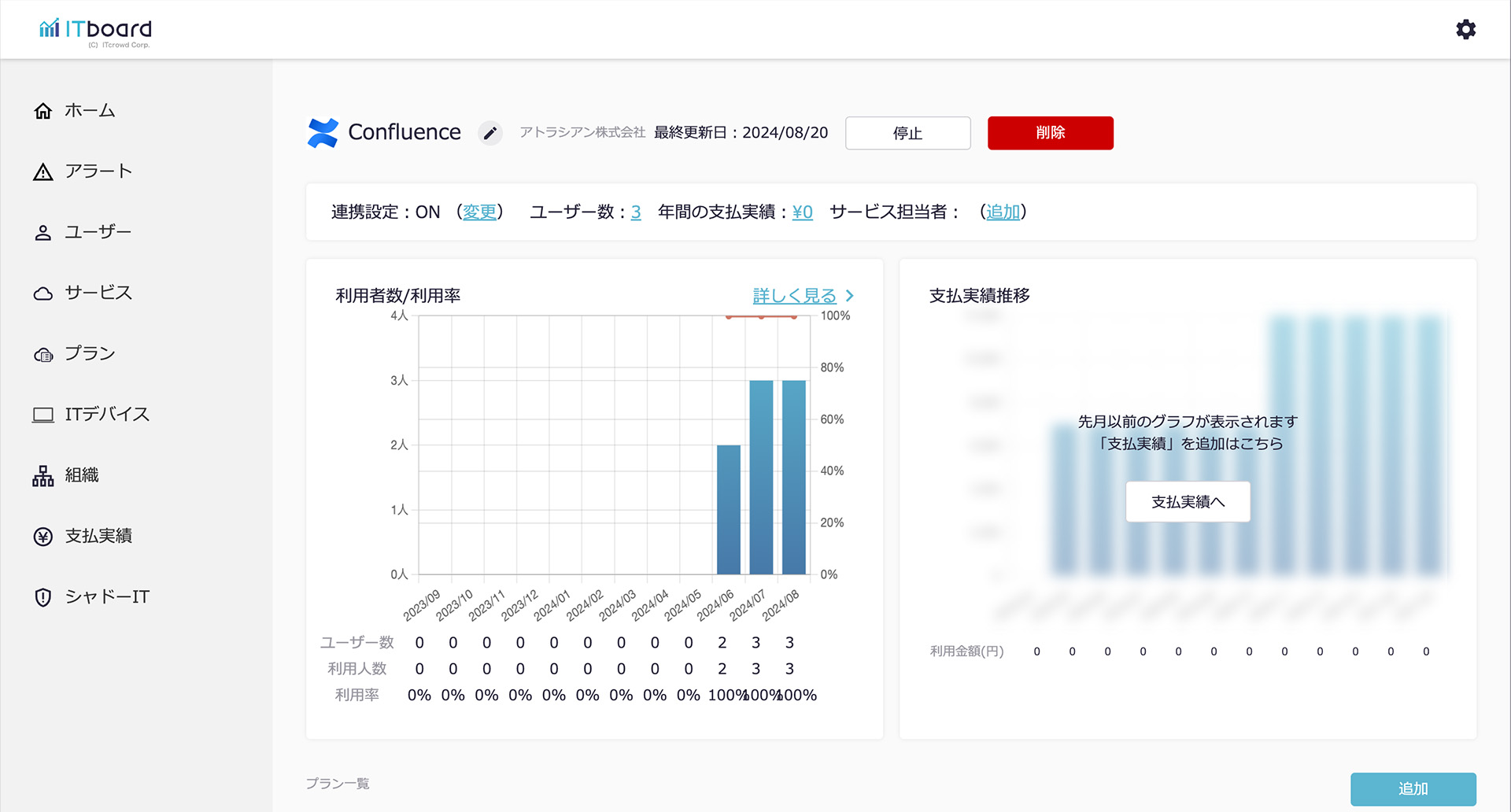 ITboardのサービス詳細画面に戻りますので、そこで「連携設定: ON」になり、「利用者数/利用率」のグラフが見られるようになっていれば、連携成功です。