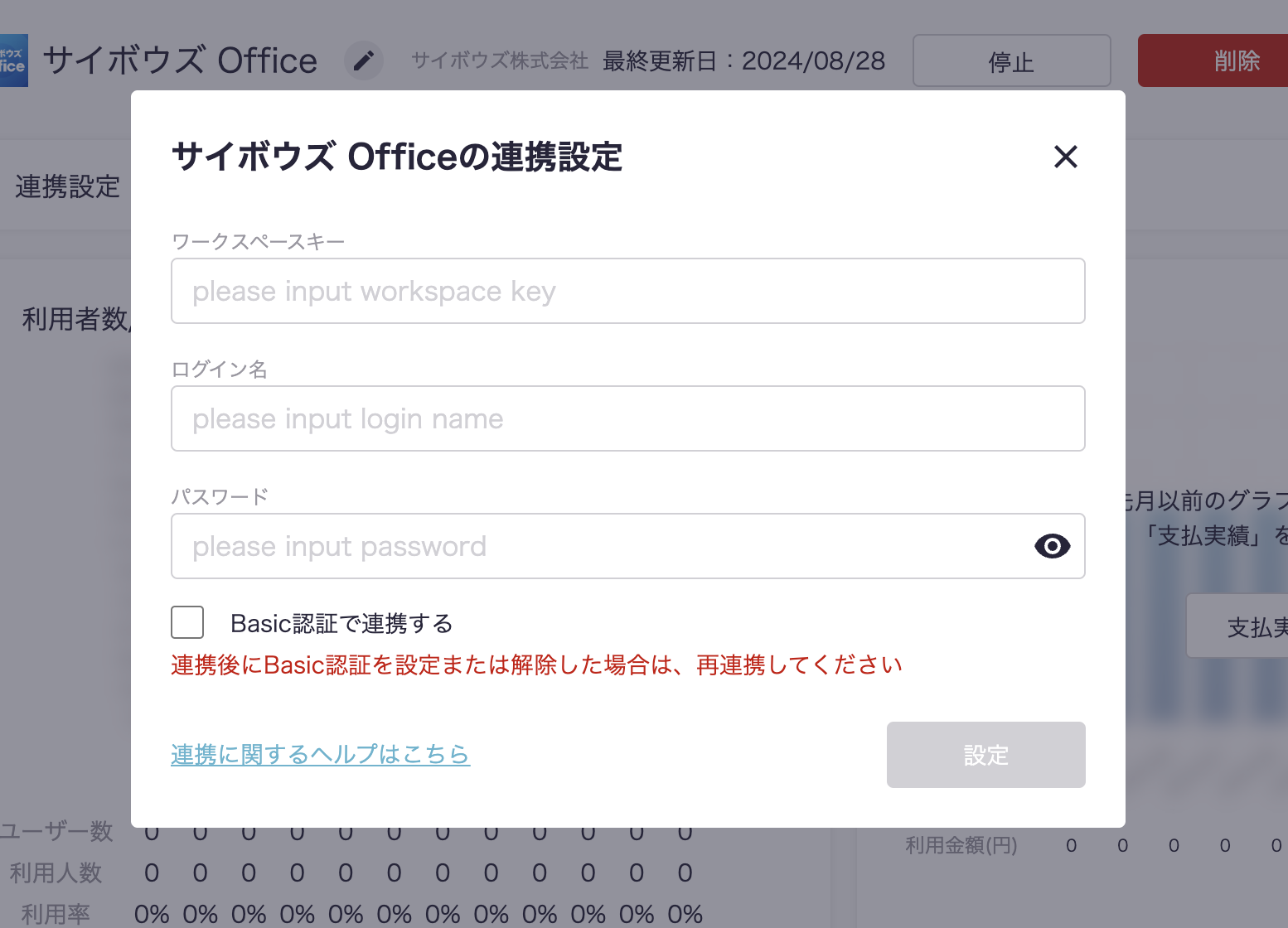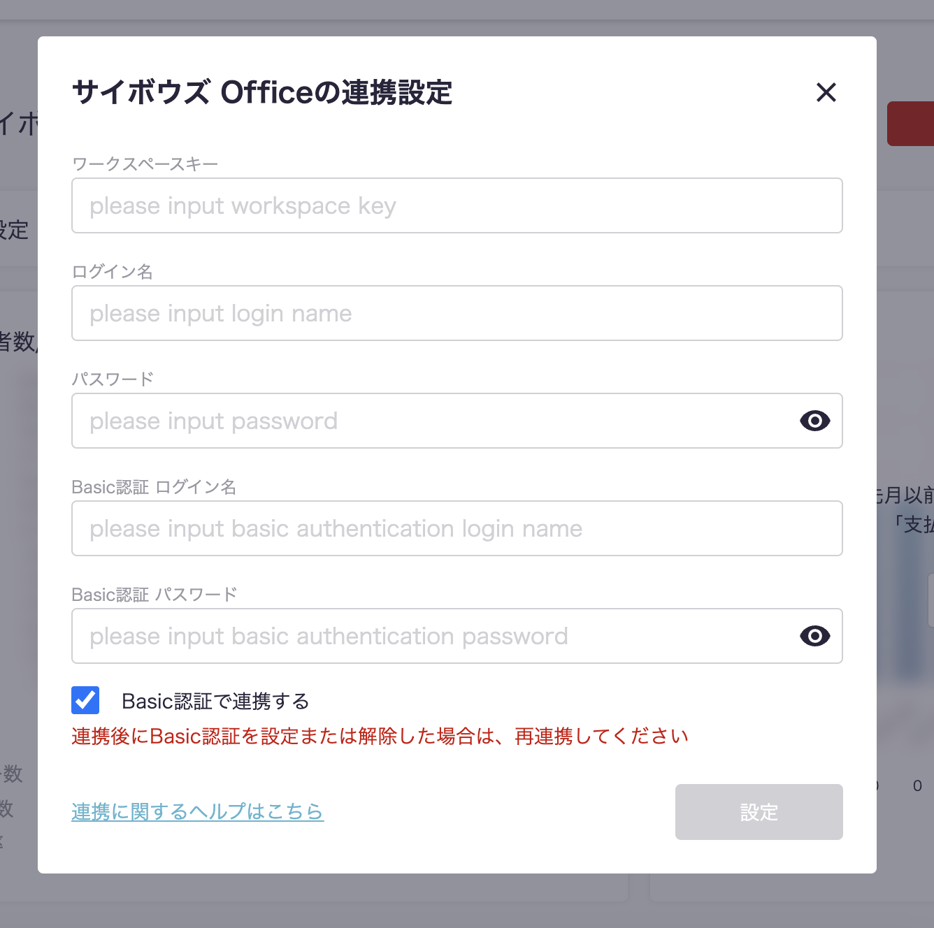 サイボウズ OfficeアカウントでBasic認証を設定している場合、『Basic認証で連携する』のチェックボックスを選択し、Basic認証用の「ログイン名」、「パスワード」も入力してください。