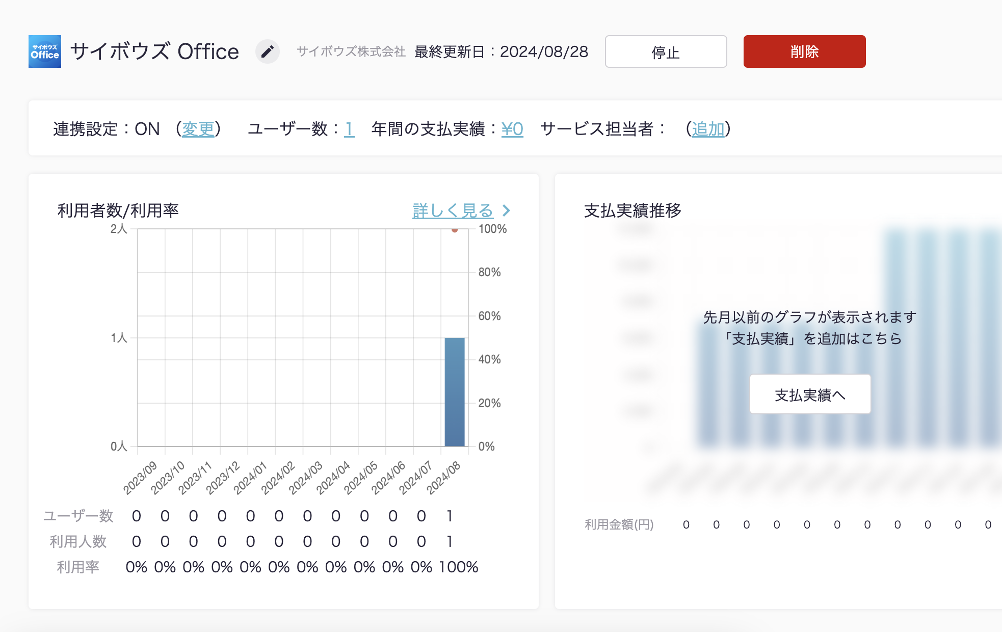 ITboardのサービス詳細画面に戻りますので、そこで「連携設定: ON」になり、「利用者数/利用率」のグラフが見られるようになっていれば、連携成功です。