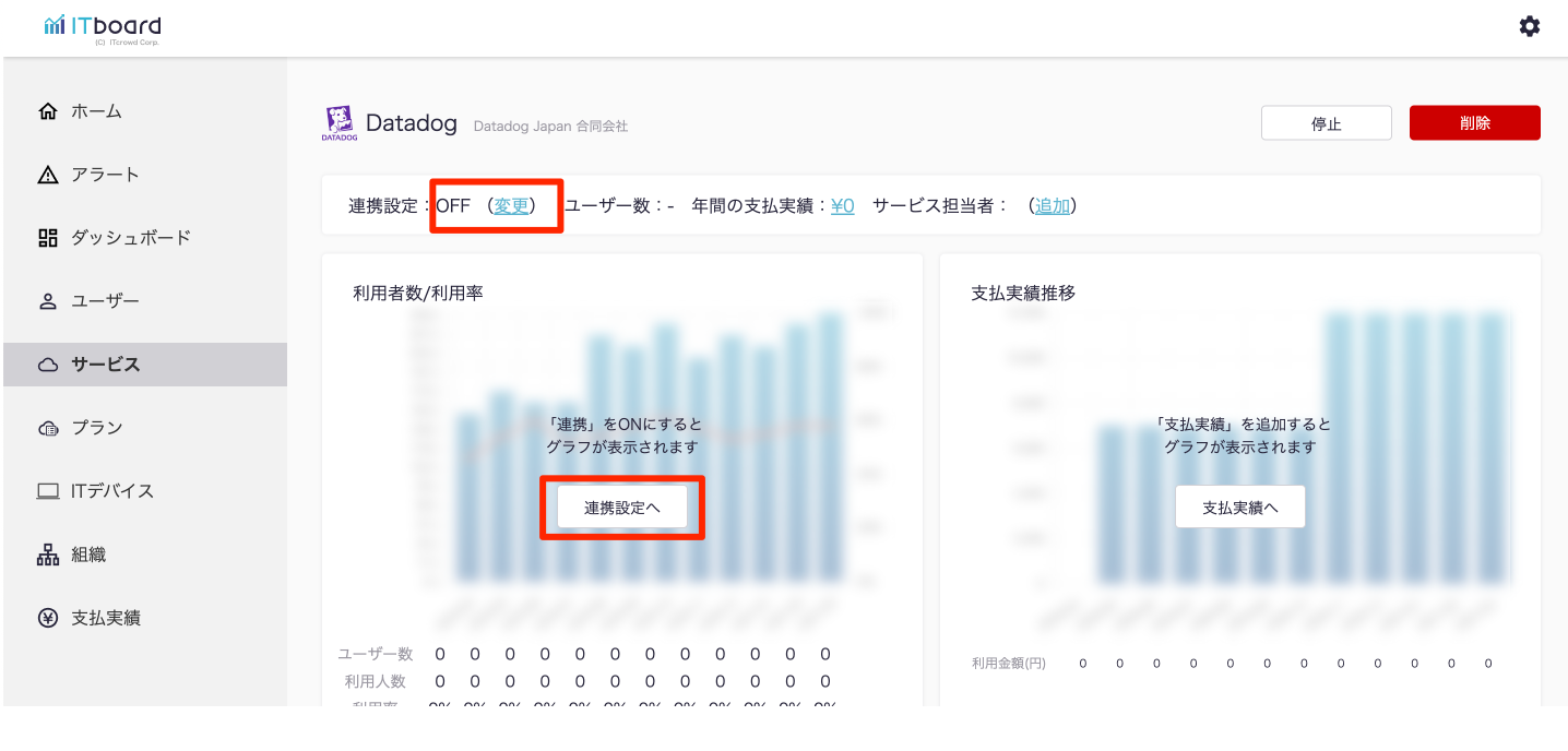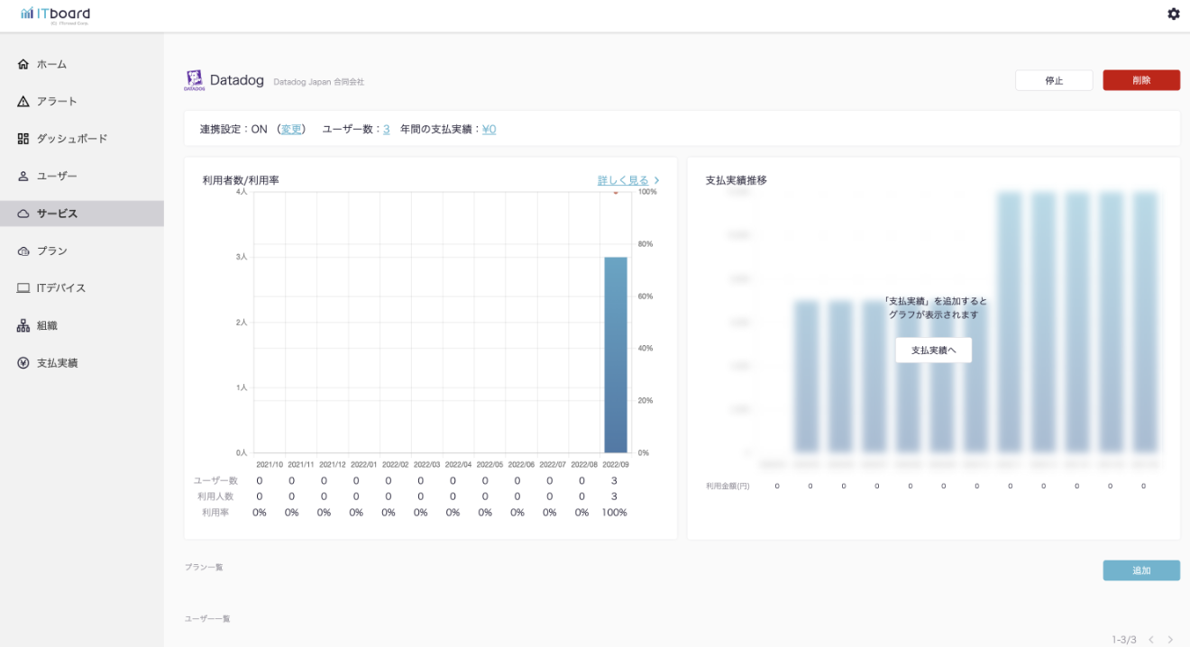 ITboardのサービス詳細画面に戻りますので、そこで「連携設定: ON」になり、「利用者数/利用率」のグラフが見られるようになっていれば、連携成功です。