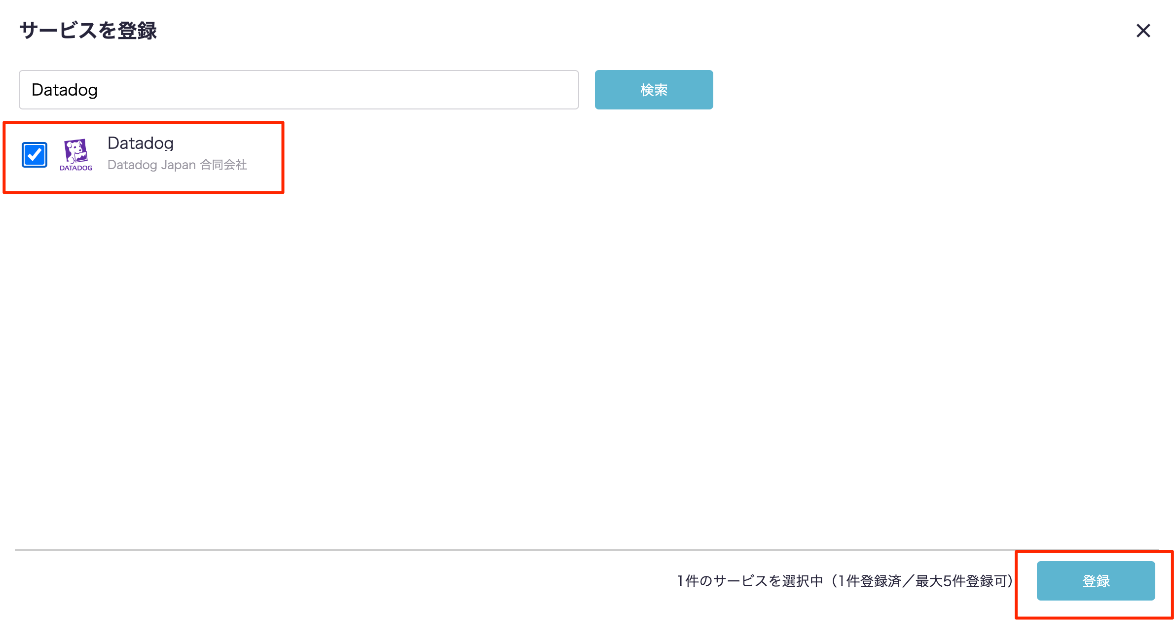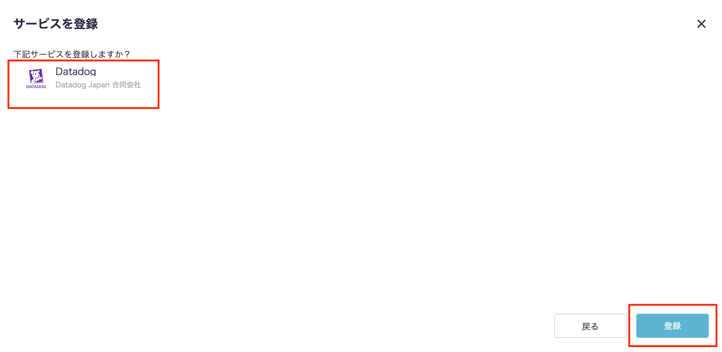 その後、下画像のようなモーダルが出現しますので、入力欄にサービス名である「Datadog」と入力します。