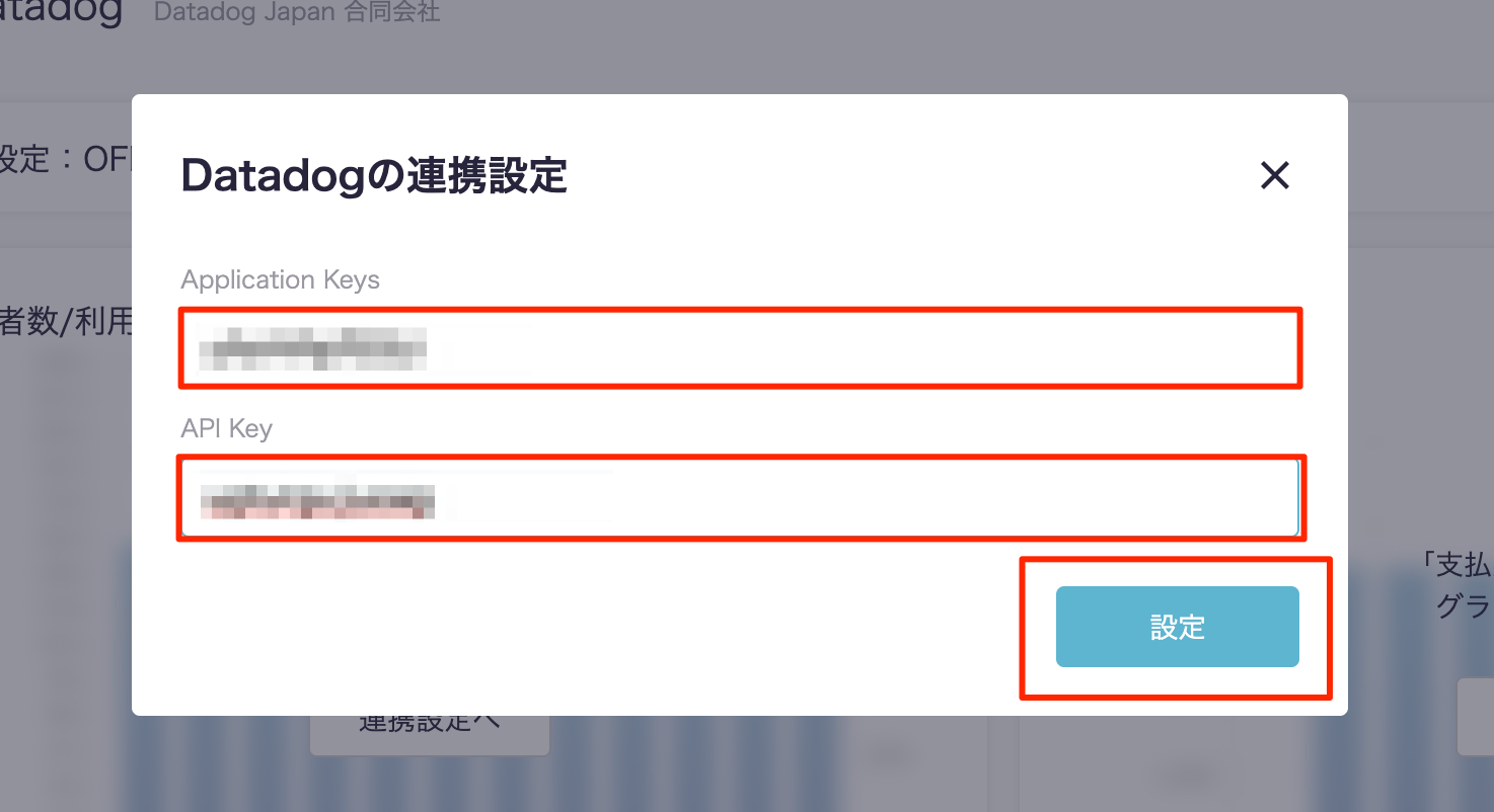 Datadogの連携設定モーダルが出現するので、「Application Keys」と「API Key」を入力し『設定』ボタンを押下します。